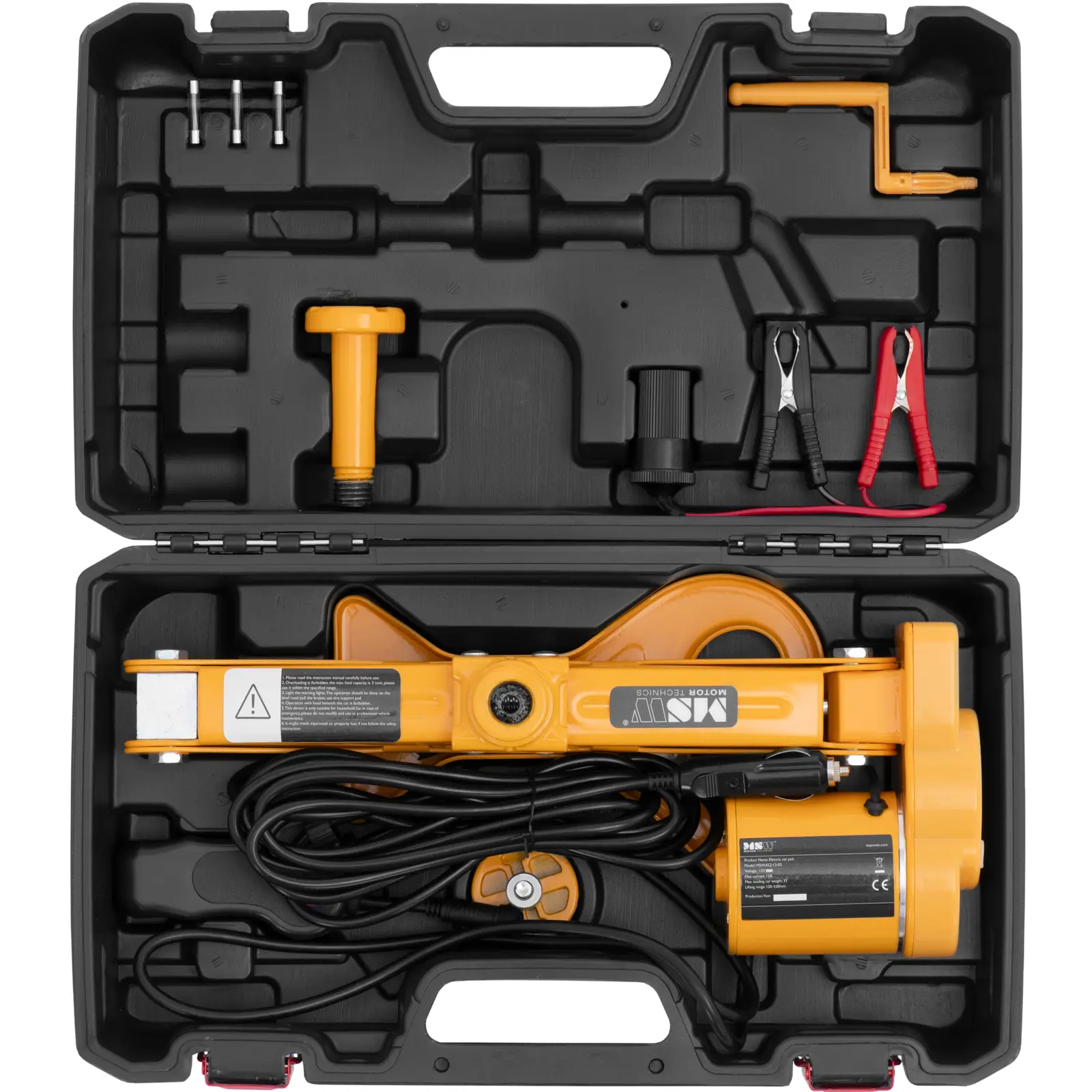 Elektryczny podnośnik samochodowy marki MSW pozwoli bezpiecznie podnieść auto w sytuacji awaryjnej. Dostarczany jest w zestawie, który składa się z podnośnika, rękawic, trójkąta ostrzegawczego, zapasowych bezpieczników i innych akcesoriów. Za pomocą narzędzia wygodnie można zmienić koło na poboczu drogi lub parkingu. Praktyczna walizka transportowa i kompaktowe wymiary lewarka sprawiają, że zestaw jest idealny dla mechaników amatorów oraz pracowników pomocy drogowej lub mobilnego serwisu naprawczego. Dzięki podnośnikowi praca będzie szczególnie wydajna, ponieważ urządzenie jest szybko gotowe do użycia. Trójkąt ostrzegawczy jest przymocowany z tyłu obudowy, dzięki czemu przejeżdżający kierowcy wyraźnie widzą, gdzie stoi pojazd. Lewarek łatwo włączyć za pomocą przewodowego pilota zdalnego sterowania. Podnośnik samochodowy podłącza się do gniazdka zapalniczki za pomocą adaptera 12 V. Można też użyć akumulatora samochodowego. W zestawie znajdują się odpowiednie klemy. Po naciśnięciu jednego przycisku podnosi pojazdy o masie całkowitej do 3 ton. Duży udźwig zapewnia wystarczającą swobodę podczas prac konserwacyjnych w różnych autach. Podnośnik samochodowy osiąga wysokość do 42 cm. Zintegrowany manometr pozwala na bieżąco kontrolować ciśnienie robocze. Dodatkowo diody LED na urządzeniu świecą się podczas jego pracy. Wszystkie akcesoria można przechować w praktycznej walizce. Dzięki wgłębieniom na podnośnik, korbę ręczną itp. nie trzeba się martwić, że elementy zestawu będą porozrzucane w środku. Futerał bezpiecznie utrzymuje wszystkie części, chroni je przed brudem, wilgocią i kurzem oraz ułatwia transport całości. Dzięki kompaktowym wymiarom elektryczny podnośnik samochodowy z akcesoriami nadaje się do każdego pojazdu.