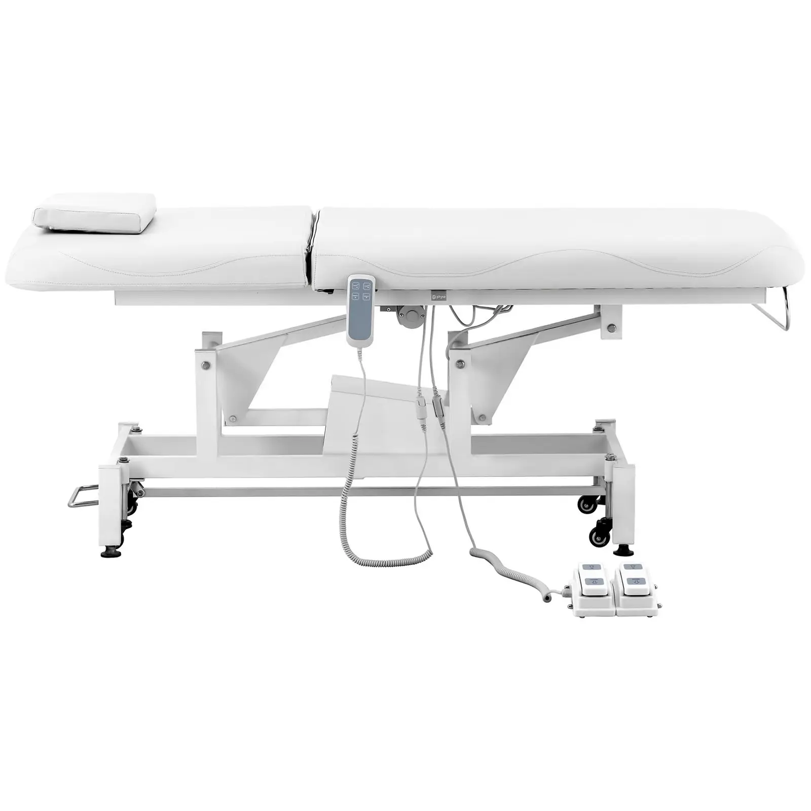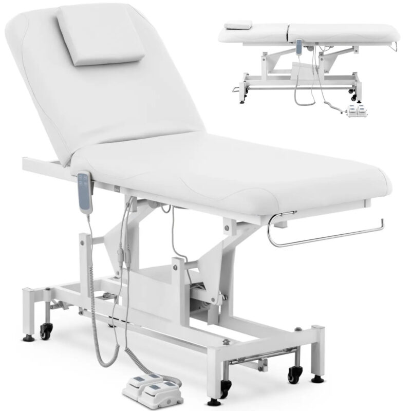 Łóżko do masażu marki physa o regulowanej wysokości jest idealnym wyposażeniem w gabinecie, studio lub w obiektach typu spa & wellness. Nadaje się zwłaszcza dla fizjoterapeutów, masażystów lub kosmetyczek. Solidna konstrukcja, regulowany kąt nachylenia oparcia oraz ergonomia sprawiają, że jest idealnie dopasowane do potrzeb zarówno klienta, jak i terapeuty. Łóżko gwarantuje przyjazną dla pleców pozycję oraz duży relaks. Stół do masażu charakteryzuje się bardzo wytrzymałą konstrukcją o dobrej stabilności, a także został wyposażony w pilota zdalnego sterowania, pedał nożny oraz uchwyt na rolkę papieru. Elektryczny stół posiada dwa silniki o łącznej mocy 50 W. Można go indywidualnie wyregulować do wysokości 680-900 mm. Dodatkowo oparcie pochyla się do 60°. Pozwoli to znaleźć najlepsze ustawienie dla klientów oraz pracowników. Pozycja siedząca lub leżąca jest opcjonalnie regulowana w zależności od rodzaju zabiegu. Zagłówek posiada zdejmowaną poduszkę. Dzięki piankowemu wypełnieniu tapicerki o różnej grubości (siedzisko: 100 / oparcie: 80 / poduszka: 40 mm) oraz przyjemnemu pokryciu ze skóry syntetycznej oferowane łóżko do masażu jest niezwykle wygodne i gwarantuje wysoki komfort podczas całego zabiegu. Za sprawą zastosowanej ekoskóry stół do masażu można szybko i łatwo wyczyścić. Pokrowiec nie wchłania płynów ani kurzu. Wysokiej jakości stal malowana proszkowo oraz stabilna konstrukcja sprawiają, że ten stół do masażu jest wytrzymały i oferuje maksymalną nośność 200 kg. W razie potrzeby do przesuwania łóżka można użyć czterech kółek. Dodatkową wygodę zapewniają uchwyty na pilota oraz rolkę papieru.