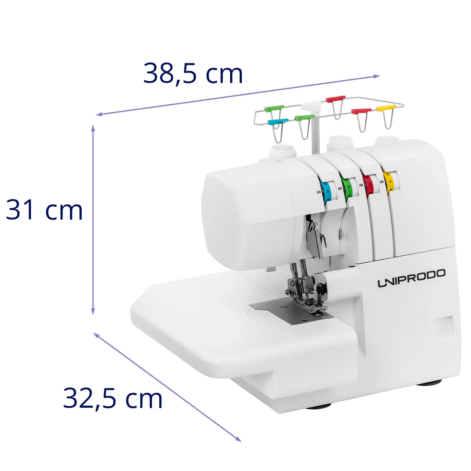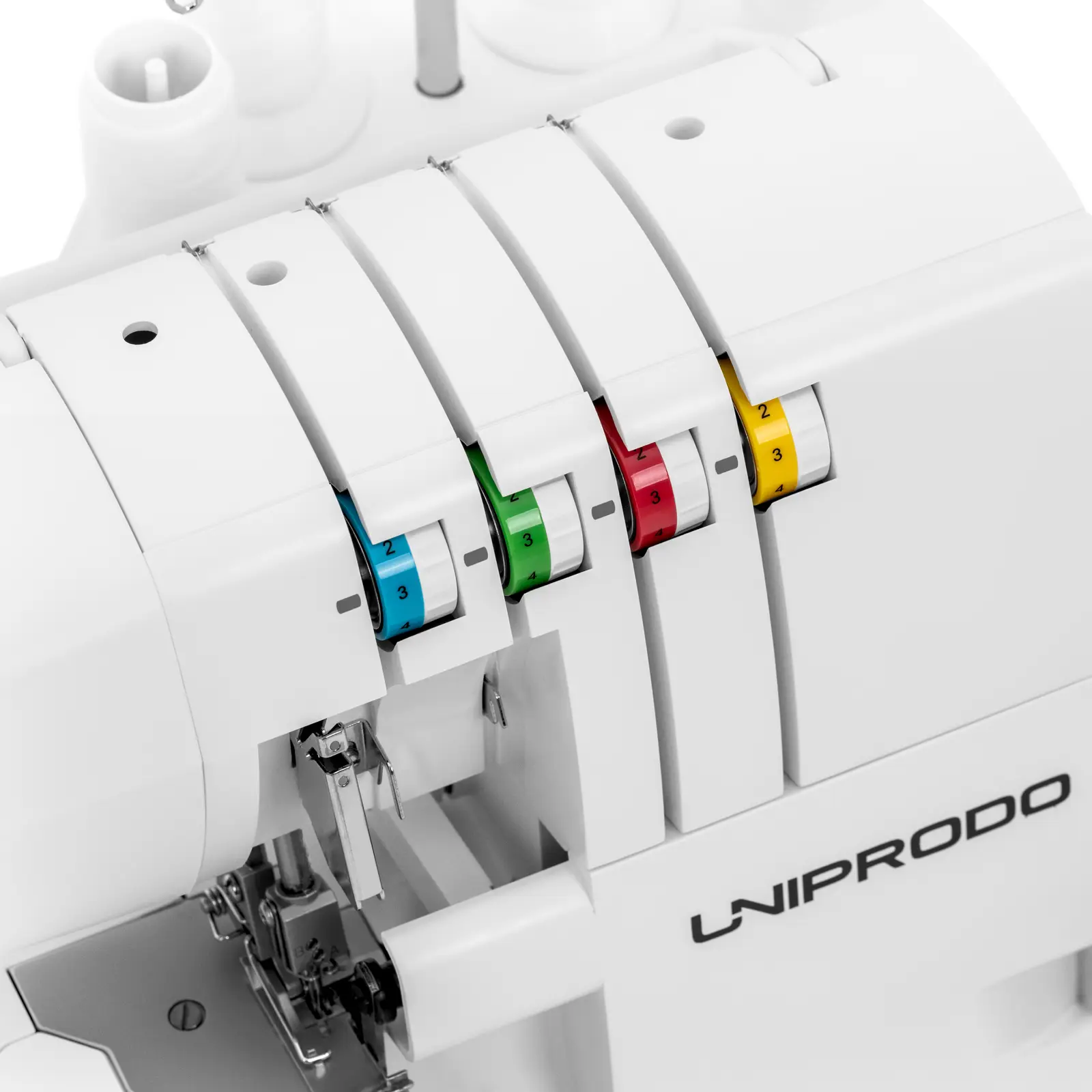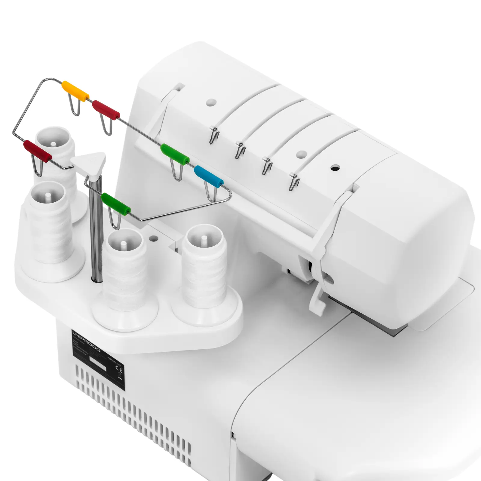 - – Kolorowa ilustracja z przodu maszyny do szycia overlock ułatwi nawleczenie aż 4 nitek,