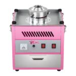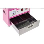 Profesjonalna maszyna do produkcji waty cukrowej z kopułką chroniącą przed czynnikami zewnętrznymi. W dolnej części maszyny zamontowano praktyczną szufladkę na akcesoria i pieniądze.
