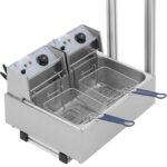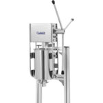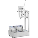 Maszyna marki Royal Catering pozwala na wydajne wyciskanie ciasta na hiszpańskie pączki a później ich smażenie na głębokim oleju o temperaturze 60-200°C. Sprawdzi się w food truckach, bistrach czy na festynach. Ergonomiczny uchwyt umożliwia wygodną ręczną obsługę. Zbiornik o pojemności 3 l i wysokości 200 mm pozwala na dozowanie dużej ilości ciasta. W komplecie znajduje się 5 lejków do różnych kształtów ciasta. Moc wynosząca 2 x 2500 W i podwójny zbiornik na olej o pojemności 12 l zapewniają wydajne smażenie. Pokrywy chronią zawartość przed zabrudzeniami. Dla bezpieczeństwa urządzenie wyposażono w dodatkowy przycisk resetowania. Maszynę wykonano ze stali nierdzewnej, jest ona łatwa w utrzymaniu czystości, solidna i idealna do kontaktu z żywnością. Pionowa konstrukcja oszczędza miejsce na blacie roboczym.