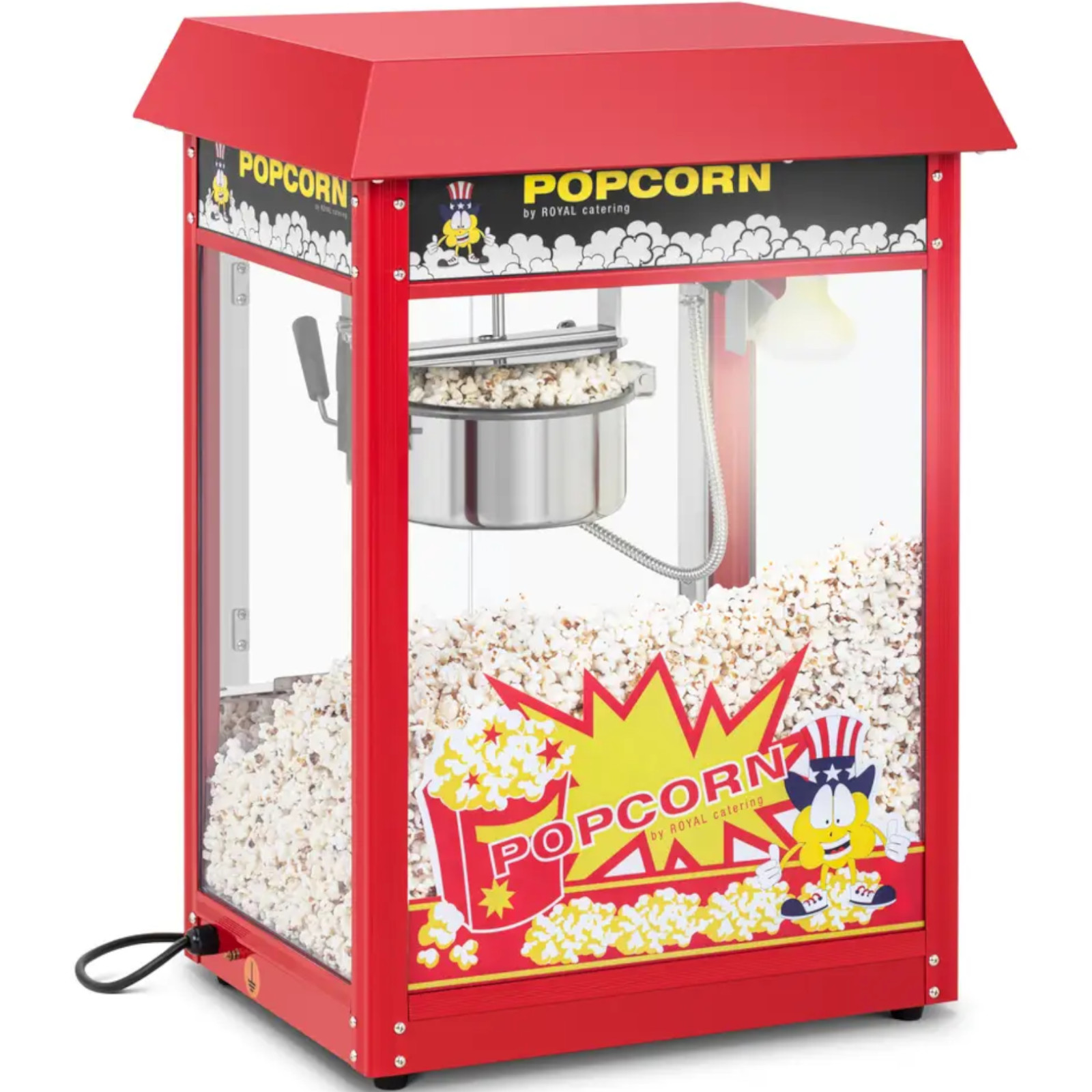 Maszyna do popcornu marki Royal Catering wyróżnia się na każdym festynie czy imprezie plenerowej. Posiada podgrzewaną i podświetlaną komorę, system mieszania oraz automatyczny termostat. Pracuje z mocą 1600 W i szybko osiąga temperaturę roboczą. Mocny silnik zapewnia dokładne rozprowadzanie ciepła wewnątrz maszyny, dzięki czemu ziarna nagrzewają się i równomiernie pękają. Urządzenie pozwala wyprodukować 16 l popcornu na godzinę (ok. 5 – 6 kg/godz.). Jest więc idealne do użytku komercyjnego. Maszyna pracuje z 2 różnymi temperaturami. Do popcornu z cukrem stosuj niższą temperaturę 150°C, a do klasycznego popcornu zalecamy temperaturę 180°C. To sprawia, że urządzenie do popcornu szczególnie nadaje się do barów z przekąskami w kinie, na wszelkiego rodzaju imprezach lub na dużych festynach. Oto jak uzyskasz chrupiący popcornu: używaj oleju kokosowego, ponieważ wytrzymuje temperaturę do 240°C bez spalania. Garnek jest pokryty teflonem, dzięki czemu popcorn nie przypala się. Ułatwia to czyszczenie, zmniejsza koszty i sprawia, że przekąski są lżejsze, ponieważ do kukurydzy potrzeba mniej oleju. Garnek ma również mieszadło, które obraca się na minimalnej wysokości nad dnem, mieszając ziarna w środku. Tryb mieszania włączany jest osobnym przyciskiem. Garnek ma średnicę 18.5 cm i głębokość 5.8 cm. Opróżniany jest z łatwością za pomocą poręcznej plastikowej rączki, dzięki czemu unika poparzeń. Lekka pokrywa garnka do popcornu utrzymuje temperaturę wewnątrz i zapewnia, że po przechyleniu gotowa kukurydza łatwo wysypuje się do dolnej komory maszyny. Aby wyczyścić garnek, wystarczy go wyjąć z kabiny. Maszyna do popcornu jest łatwa w utrzymaniu, została wykonana z wysokiej jakości stali nierdzewnej i hartowanego szkła. Dzięki temu urządzenie jest bardzo wytrzymałe i bezpieczne dla żywności. Maszyna do popcornu posiada oświetlenie komory grzewczej. W ten sposób idealnie ustawisz punkt z przekąskami w dowolnym momencie, nawet po zapadnięciu zmroku. Duża komora jest otwierana przez przezroczyste drzwiczki z magnetycznym zamknięciem. Zamknięcie bezpiecznie utrzymuje lekki popcorn w środku, a jednocześnie umożliwia szybkie otwieranie przy niewielkim wysiłku. Popcorn można wyjąć jeszcze szybciej i bez otwierania drzwiczek dzięki uchylnej szufladzie pod komorą.