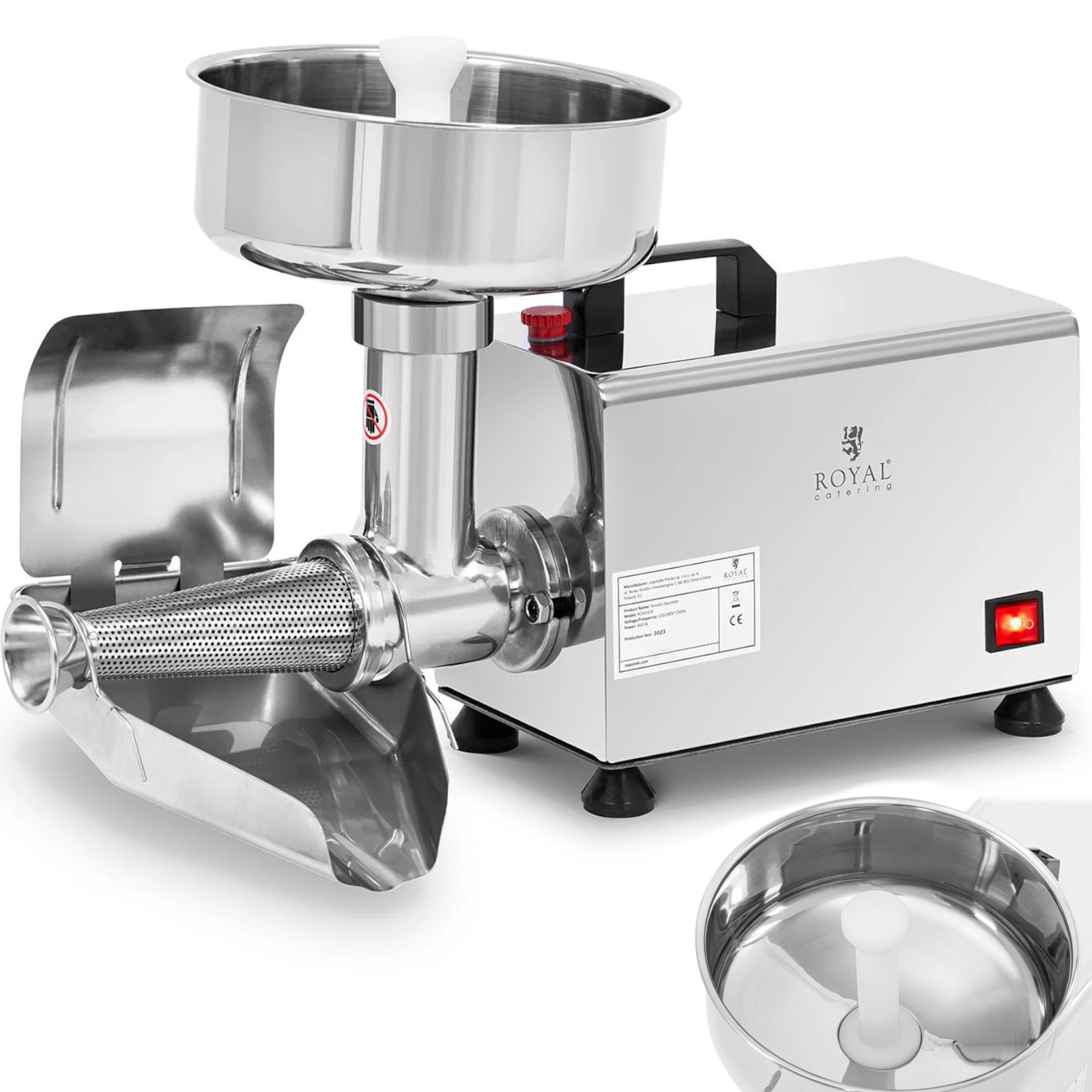 Wyciskarka do pomidorów i jabłek marki Royal Catering to świetne rozwiązanie do przetwórstwa świeżych pomidorów, jabłek czy innych miękkich owoców i warzyw. Sprawdzi się w restauracjach, hotelach, barach i firmach cateringowych, do przygotowywania sosów, zup, przecierów czy innych smakołyków. Urządzenie generuje do 80 obr./min dzięki silnikowi o mocy 450 W. Pozwala to wycisnąć duże ilości owoców i warzyw w krótkim czasie, co daje doskonale przetworzone składniki bez nasion i łupin. Duży lejek o średnicy 214 mm pozwala na nieskomplikowane i czyste wrzucanie składników. Urządzenie wykonano ze stali nierdzewnej, która jest odporna na korozję i czynniki zewnętrzne oraz higieniczna.