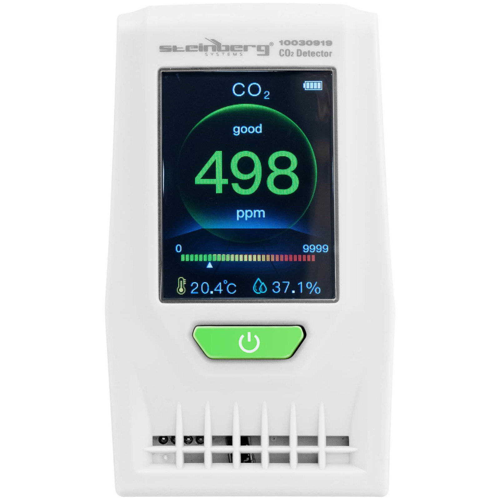Miernik CO2 marki Steinberg Systems pozwala kontrolować wartość dwutlenku węgla oraz temperaturę i wilgotność. Wyświetlacz LCD pokazuje wartość w zakresie 0-9999 ppm. Można także ustawić minimalne i maksymalne wartości mierzonego CO2. Alarm włączy się w przypadku przekroczenia lub osiągnięcia zakresu pomiarowego. Urządzenie mierzy temperaturę w zakresie -10 – 60°C lub 14-140°F z dokładnością +/- 1°C/1,8°F oraz wilgotność w przedziale 0,1 do 100,0 % wilgotności względnej w warunkach otoczenia 25°C i 30-99% RH z dokładnością +/- 3%. Zapis poniżej 30% RH wyświetlany jest z dokładnością +/-4%. Obudowę urządzenia wykonano z trwałego plastiku. Miernik zasilany jest zasilaczem lub w razie potrzeby bateriami.