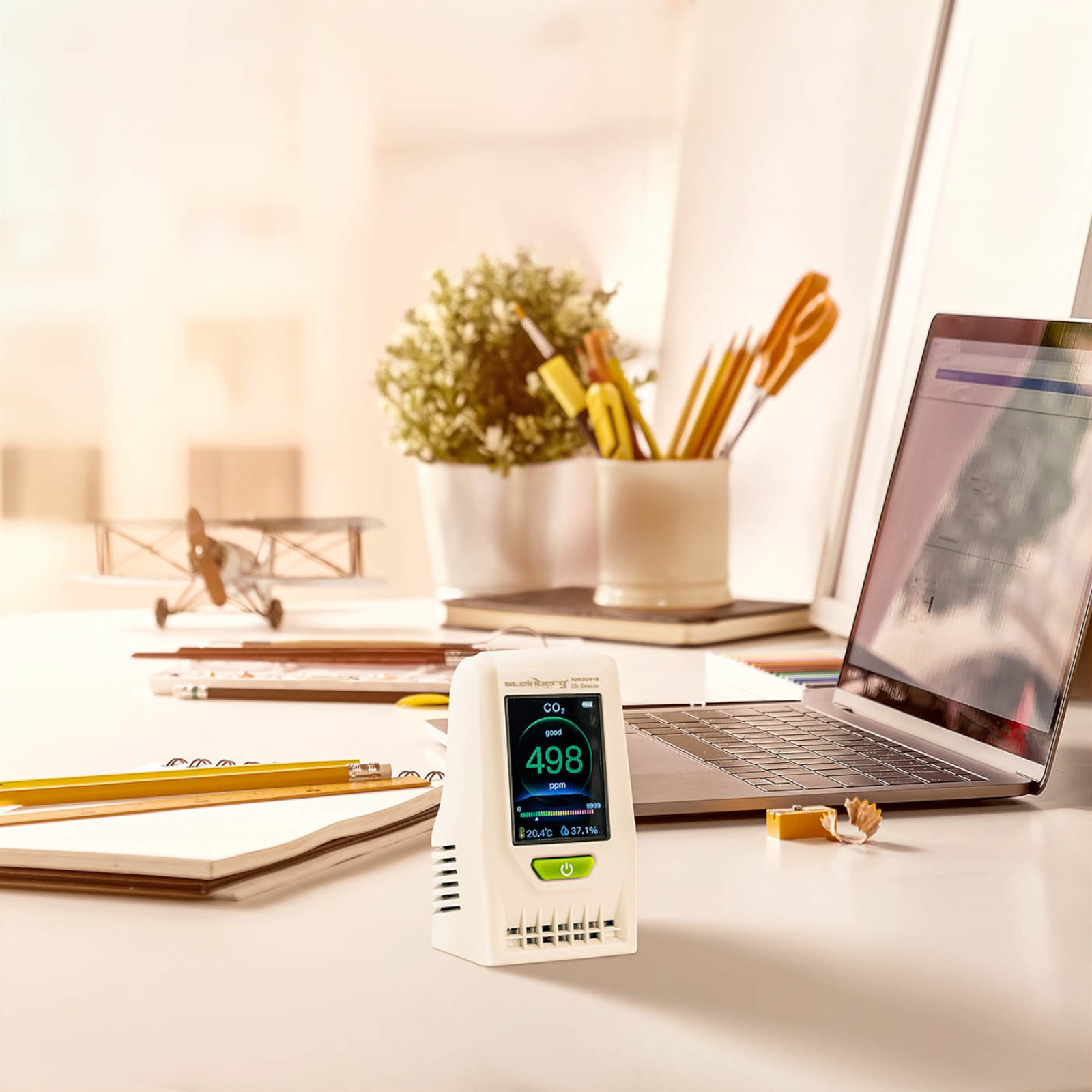 - – Wyniki pomiarów CO2 i wilgotności z dokładnością +/- 3% a także w temperaturze +/-1°C (1,8°F),