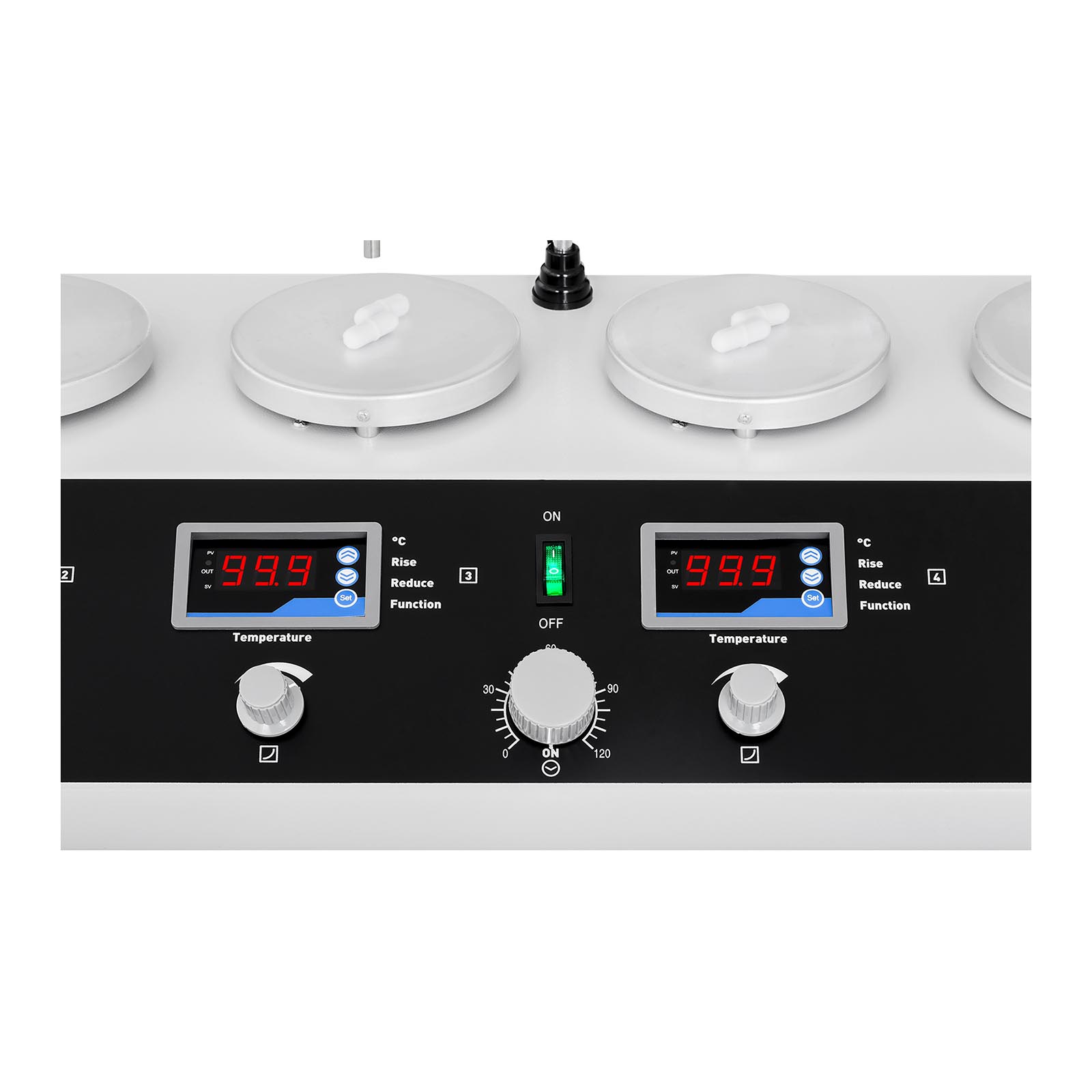 Mieszadło magnetyczne SBS-MR-1600/6 zostało wyposażone w sześć platform, które są sterowane niezależnie do siebie. Pozwala to na ustawienie różnych trybów pracy w jednym czasie. Średnica jednej platformy wynosi 120 mm i zmieści kolbę o pojemności do 1 L. Wbudowane grzałki maksymalnie mogą podgrzać płyn do temperatury 99°C i są sterowane za pomocą cyfrowych wyświetlaczy. Czujniki do mierzenia temperatury płynu są montowane na dołączonych statywach.
