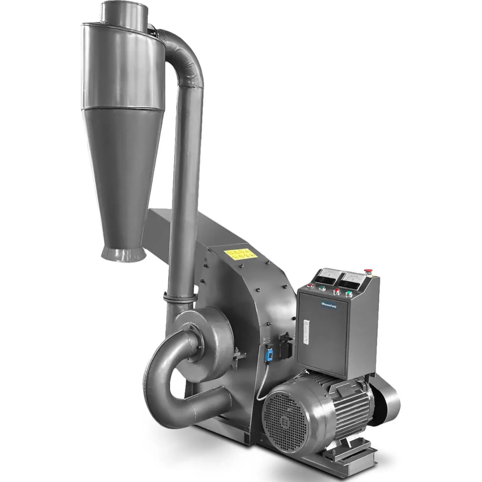 Młyn bijakowy marki Wiesenfield to wydajna maszyna rozdrabniająca szeroką gamę materiałów do rozmiarów ziarna, które można łatwo dalej przetwarzać. Sprawdzi się do zboża, słomy, lucreny czy wiórów drzewnych. Otrzymana śruta nadaje się do produkcji pasz dla zwierząt lub do produkcji pelletu drzewnego. Przy mocy wyjściowej 11 kW silnik o prędkości obrotowej 2982 obr./min napędza 16 młotów w młynie. Wydajność sprzętu wynosi 300 – 700 kg/h i zależy od rodzaju ziarna lub surowca i zawartości wilgoci w materiale. Aby uzyskać najlepsze wyniki, wilgotność nie powinna przekraczać 15%. Ziarna są dobijane do sita zewnętrznego przez siły odśrodkowe działające na śrutę podczas rozdrabniania. Rozmiar otworu sita określa, jak grubo będzie mielił młynek. Dla młyna bijakowego dostępne są otwory o rozmiarach 4 i 6 mm. Gotowy przemiał jest celowo napełniany przez cyklon. Rozdrabniacz bijakowy do zboża imponuje łatwością obsługi, dużym zbiornikiem i solidną konstrukcją. Pozwala to produkować i przetwarzać duże ilości mielonego materiału. Stabilna podstawa gwarantuje bezpieczną pracę.