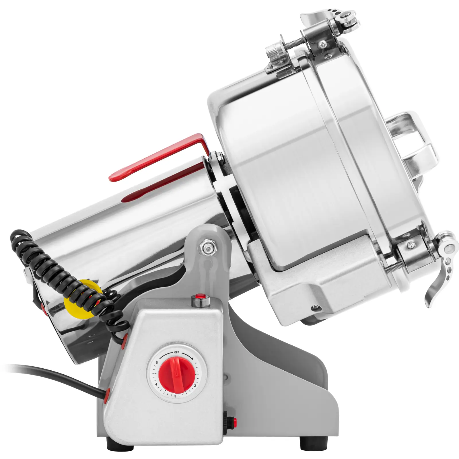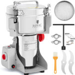 Elektryczny młynek do przypraw marki Royal Catering to idealne narzędzie, aby precyzyjnie posiekać przyprawy lub zioła. Duża pojemność do 1000 g sprawia, że młynek nadaje się zarówno do użytku domowego, jak i komercyjnego. Potężny silnik 3000 W napędza ostre jak brzytwa noże do 35000 obr./min. Dzięki temu w ciągu kilku sekund mielone są suche produkty, takie jak pieprz, orzechy, ziarna kawy lub laski cynamonu. Wbudowany minutnik ustawiany jest za pomocą pokrętła w zakresie 0 – 5 minut. Ze względu na dużą moc, większość produktów rozdrabnianych jest w 30 s. Tylko twardsze składniki potrzebują około 1 minuty. Można także przechylić pojemnik o 270° za pomocą bocznego pokrętła i łatwo wysypać zawartość. Dwa solidne zatrzaski na pokrywie zapobiegają niezamierzonemu otwarciu podczas pracy i chronią przed urazami. Dzięki hermetycznej pokrywie z rączką w pojemniku możesz przechować świeżo zmielone przyprawy lub zioła. Zbiornik, ostrza i korpus wykonane są z odpornej na korozję stali nierdzewnej powszechnie stosowanej w gastronomii. Materiał ten gwarantuje długą żywotność elektrycznego młynka. Antypoślizgowe gumowe nóżki tłumią drgania i zapewniają stabilność. Chronią również powierzchnię roboczą przed zarysowaniami.