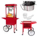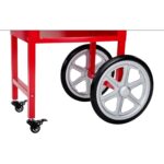 Urządzenie wraz z wózkiem stanowi bardzo atrakcyjne i efektowne stanowisko do sprzedaży POPCORNU. Wózek posiada dwa solidne duże koła oraz dwa mniejsze zaopatrzone w hamulce oraz praktyczną szafkę na przybory i zapas kukurydzy.