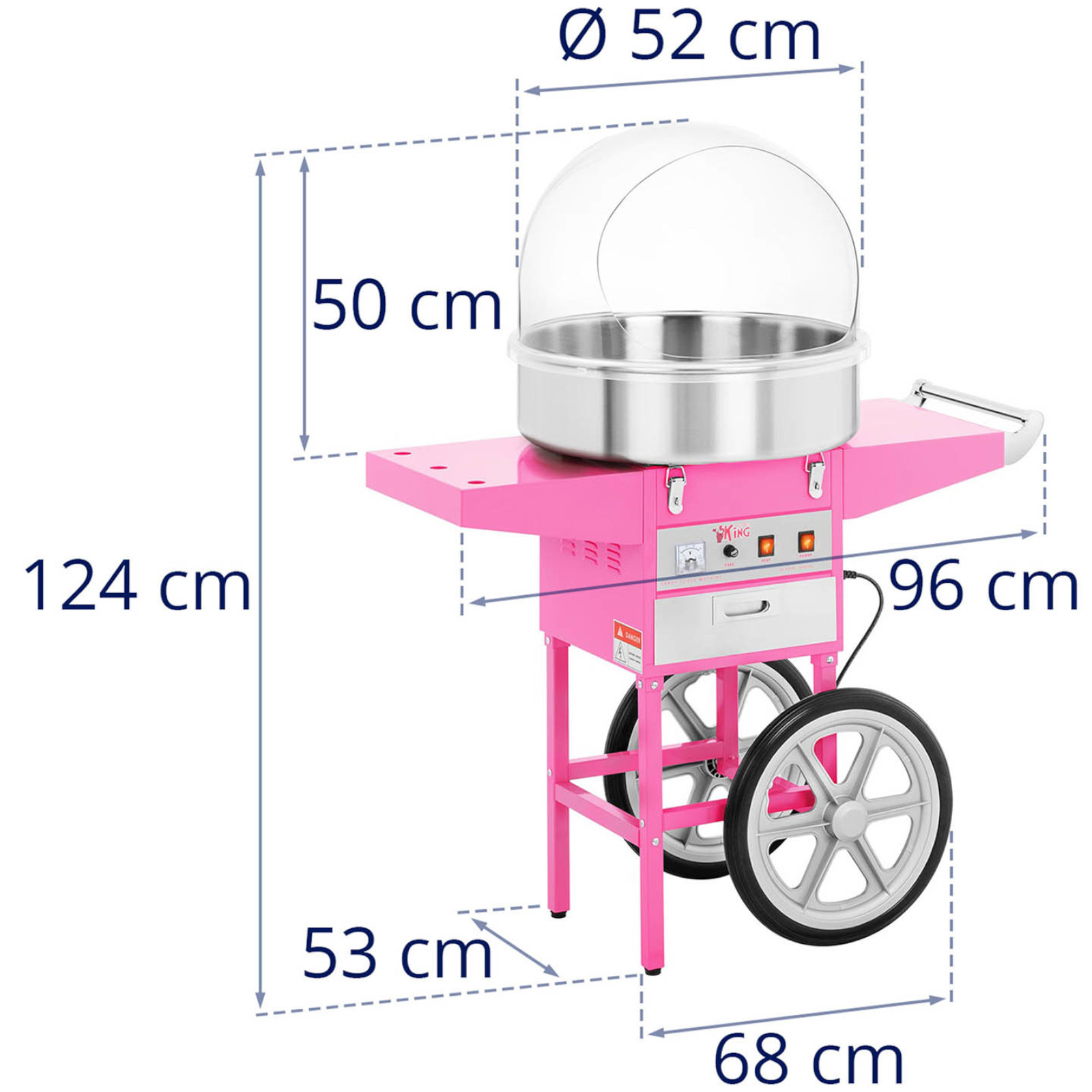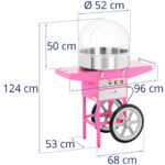 Urządzenie zostało wykonane ze stali szlachetnej, która zapewnia biologiczną neutralność, trwałość i odporność na obicia oraz porysowania. Jest także łatwa w czyszczeniu, elementy wykonane ze stali nierdzewnej nadają się do mycia w zmywarce. Misa o średnicy 52 cm (rozmiar L) umożliwia zrobienie przekąski w różnych wielkościach. Dużą wydajność sprzętu zapewnia element grzewczy o mocy 1200 W. Umożliwia on przygotowanie jednej porcji waty z 12-18 g cukru w bardzo krótkim przedziale czasowym (30 do 60 sekund). Urządzenie wyposażono w dwa przyciski – jedne włącza grzanie, drugi obroty głowicy. Przezroczysta pokrywa z plastiku pozwala obserwować proces powstawania waty cukrowej oraz zabezpiecza przed wiatrem, zabrudzeniami czy czynnikami zewnętrznymi. Mobilność sprzętu to zasługa wózka z dwoma dużymi gumowymi kołami. Sprawdzą się one nawet na wyboistej drodze. Stabilne nóżki zapewniają stabilność. Obszerna szuflada podzielona została na trzy komory umożliwiające przechowywanie akcesoriów.