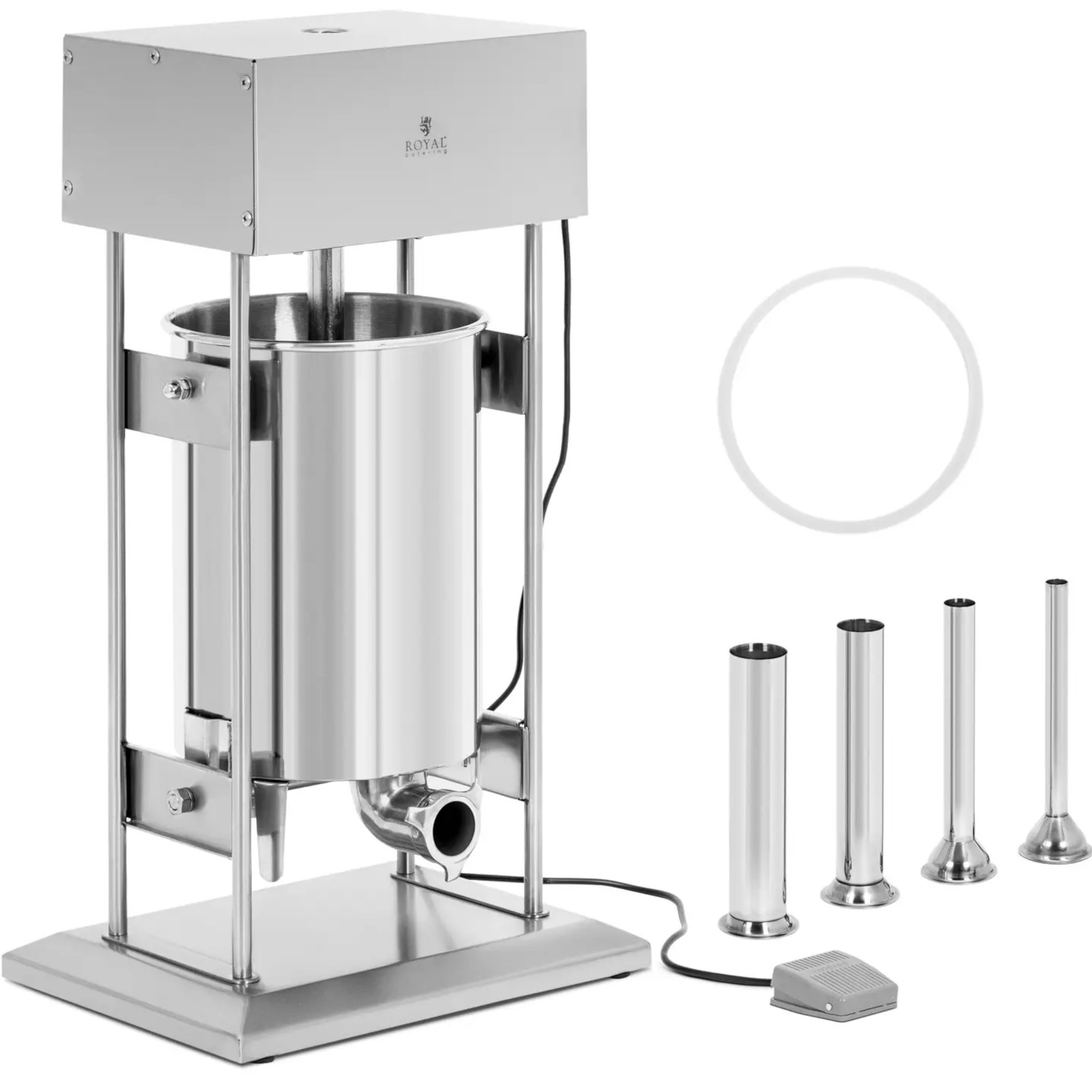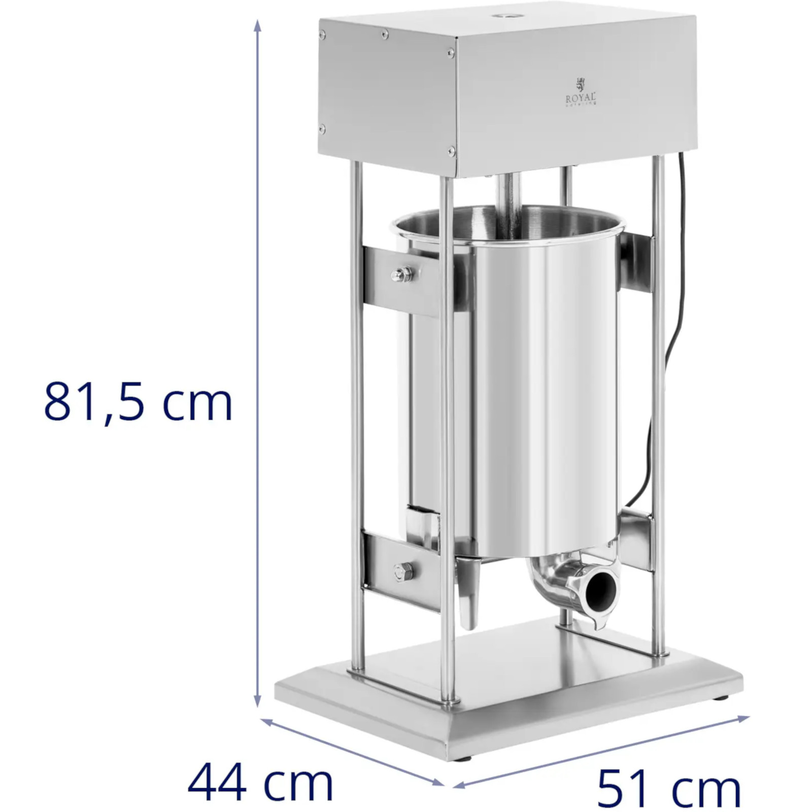 Elektryczna nadziewarka do kiełbas marki Royal Catering pozwoli sprawnie przygotować różne mięsne specjały. Dba o to duża pojemność, mocny silnik oraz pedał nożny. Sprawdzi się w masarniach, restauracjach i innych obszarach przetwórstwa mięsnego oraz do domowych wyrobów. Elektryczna nabijarka do kiełbas posiada cylinder 20 l oraz mocny silnik 300 W. Duża pojemność i wydajność pozwoli przetworzyć duże ilości mięsnej masy w bardzo krótkim czasie. Obsługa jest bardzo prosta. Można swobodnie ustawić prędkość roboczą za pomocą kontrolera. Tłokiem steruje się za pomocą pedału, dzięki temu wolne ręce przydadzą się do innych zadań. Cztery dostarczone lejki w rozmiarach 16, 22, 32 i 38 mm pozwolą pracować niezwykle elastycznie i zmieniać rodzaj i średnicę wędlin. Wymiana lejków do napełniania jest szybka i nieskomplikowana. Lejki i nadziewarka wykonane są z wysokiej jakości stali nierdzewnej. Wszystkie elementy szprycy do kiełbas są zatem szczególnie odporne na korozję i inne czynniki, łatwe do mycia i bezpieczne dla żywności. Higieniczna uszczelka silikonowa w płycie dociskowej zapobiega wyciekaniu zawartości szprycy. Oznacza to mniej bałaganu i marnowania żywności. Antypoślizgowe gumowe nóżki zapewniają stabilność i utrzymują maszynę do kiełbasy bezpiecznie na blacie.