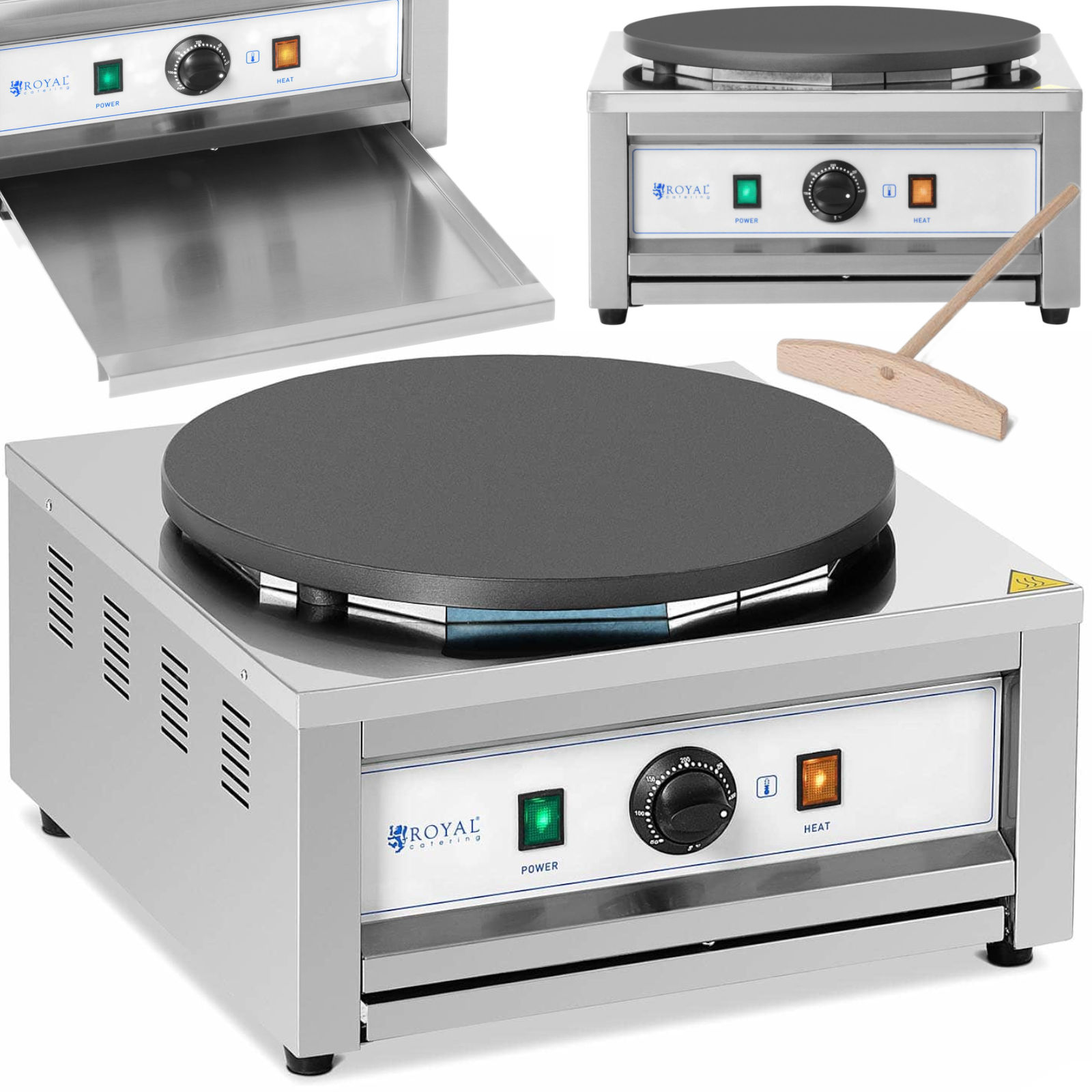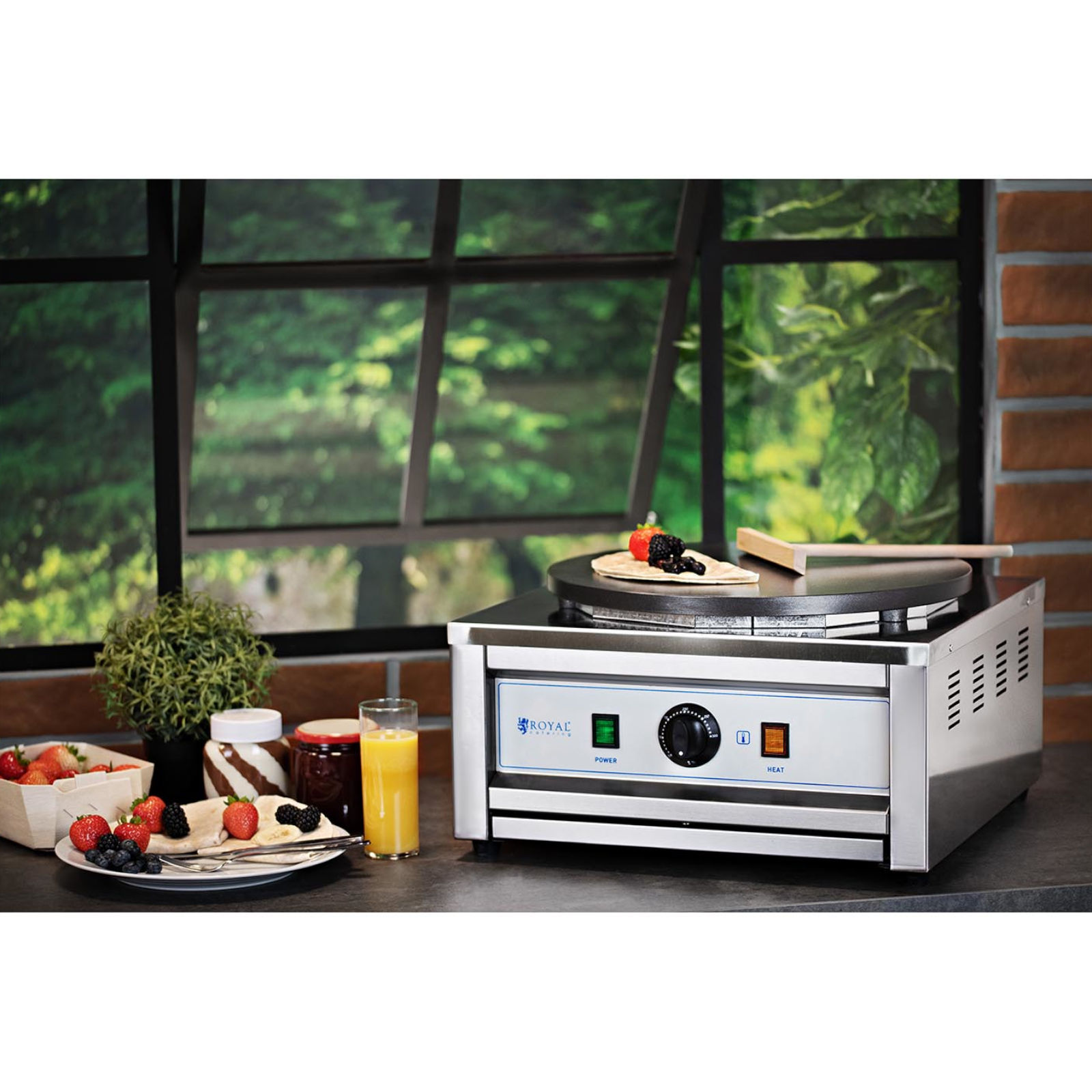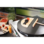 Naleśnikarka marki Royal Catering sprawdzi się w prywatnych domach, restauracjach, kawiarniach, stołówkach i nie tylko. Pozwala szybko i wygodnie usmażyć naleśniki, bliny, tortille, quesadille czy fajity. Urządzenie posiada dużą moc 3000 W, szybko osiąga ustawioną temperaturę. Termostat umożliwia regulację grzania w zakresie 0-300°C oraz utrzymuje wskazaną temperaturę. Gładka powierzchnia umożliwia smażenie dużych naleśników o średnicy 400 mm. Wykonana została z żeliwa, które długo utrzymuje temperaturę.