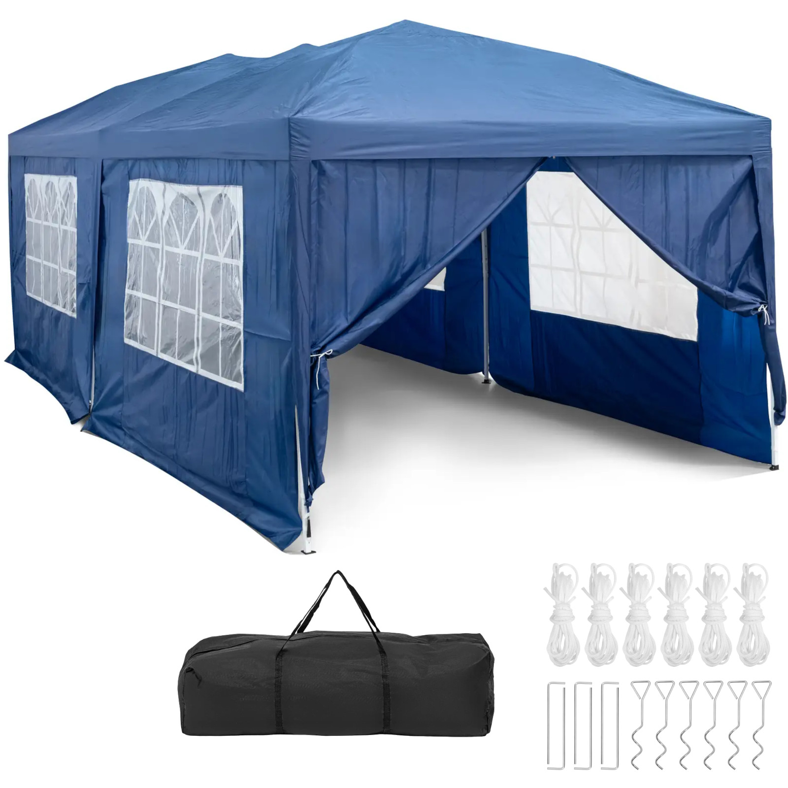 Pawilon ogrodowy marki Uniprodo to dobry pomysł na każdą imprezę plenerową, taką jak wesele, grill czy pchli targ niezależnie od tego, czy pada deszcz, czy świeci słońce. Składany pawilon cechuje się szybkim montażem, stabilną ramą i materiałami odpornymi na warunki atmosferyczne, które zapewnią niezawodną ochronę. Wiata namiotowa pozwoli zaoferować gościom miejsce w ogrodzie, w którym poczują się komfortowo. Wysokiej jakości plandeka i ściany z tkaniny 210D Oxford mają wodoodporną powłokę, która ochroni przed deszczem. Materiał jest również odporny na promieniowanie UV, dzięki czemu jest niezwykle trwały. W razie potrzeby można przymocować ścianki boczne i połączyć je zamkami błyskawicznymi. Cztery z sześciu ścian mają przezroczyste okna. Malowane proszkowo stalowe rury ramy nie korodują, są bardzo wytrzymałe i nadają się do użytku na zewnątrz. Pawilon ogrodowy o powierzchni 2,95 x 5,85 m oferuje mnóstwo miejsca dla maksymalnie 10 osób. Namiot – altanę można przechować w torbie, co pozwala zaoszczędzić miejsce i ułatwia transport. Dzięki przemyślanemu mechanizmowi składania, konstrukcję rozkłada się w zaledwie kilka chwil. Rury można ustawić na trzech wysokościach 2,47 m, 2,53 m i 2,59 m. Dzięki temu łatwo dostosować namiot do otoczenia. Dodatkową stabilność zapewnia 12 haków i 6 lin, które wykorzystuje się do bezpiecznego utrzymania konstrukcji w miejscu.