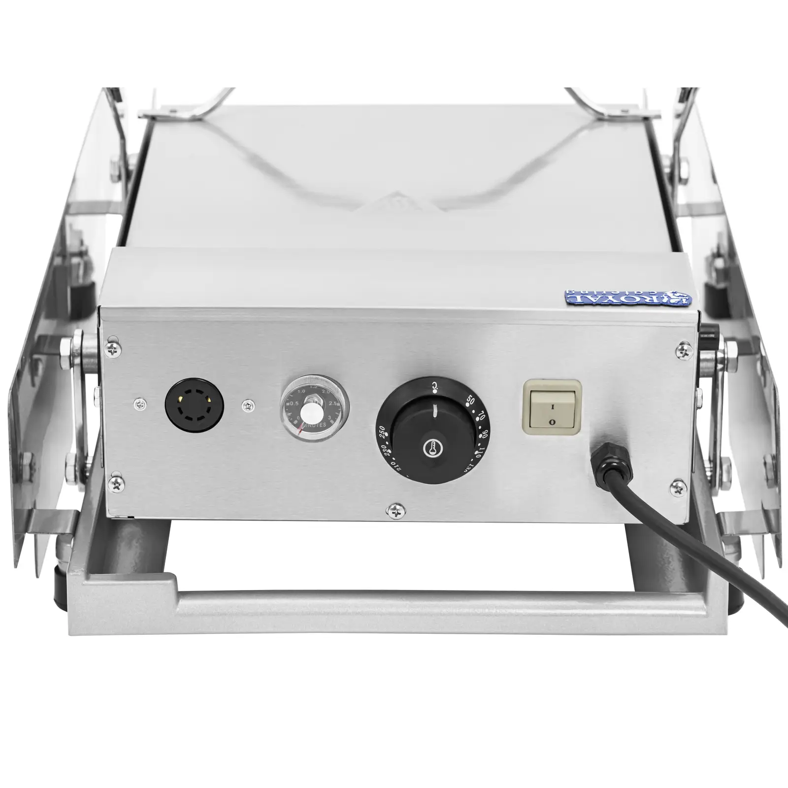 Opiekacz do bułek marki Royal Catering pozwala grillować pieczywo do burgerów na złotobrązowy kolor z obu stron w ciągu kilku minut. Sprawdzi się do bułek do hamburgerów w barach z przekąskami, restauracjach, burgerowniach, i podobnych lokalach. Urządzenie wyposażono w timer z sygnałem alarmowym, regulację grzania oraz płyt grillowych o wymiarach 320 x 440 mm. Opiekacz ma moc 2400 W, temperaturę reguluje się w zakresie 0-250°C a czas grillowania między 0 – 3 min. Za sprawą 2 dużych płyt grillowych urządzenie opiecze z obu stron do 12 bułek hamburgerowych, aż będą chrupiące. Gdy zaś grillowania dobiegnie końca, rozlegnie się sygnał dźwiękowy. Aluminiowe płyty grillowe równomiernie rozprowadzają ciepło i optymalnie przenoszą ustawioną temperaturę. Ich wysokość można dowolnie ustawić, dzięki czemu sprawdzą się do grillowania chleba, panini i bagietek o wysokości od 2 do 5,5 cm lub utrzymują je w cieple do momentu podania. Powłoka zapobiegająca przywieraniu sprawia, że pieczywo łatwo można wyjąć z grilla, bez zbrylania i kruszenia. Aby zapewnić bezpieczne użytkowanie bez poparzeń, opiekacz do bułek jest wyposażony w 2 duże łopatki. Ponadto toster do hamburgerów łatwo można otworzyć i zamknąć za pomocą dużego uchwytu. Obudowa opiekacza została wykonana z wytrzymałej stali nierdzewnej. Jest trwała i szczególnie łatwa do czyszczenia.