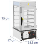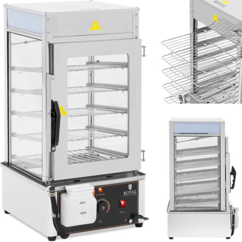 Parowar marki Royal Catering sprawdzi się w restauracjach, na stołówce czy w bufetach. Pozwala przygotować pierogi, pierożki dim sum i pampuchy, a także utrzymuje jedzenie w cieple bez wysychania. Dzięki dwuwarstwowej komorze ze szkła para i ciepło nie przedostają się na zewnątrz, co znacząco przyspiesza gotowanie. Nawet mrożone pierogi będą gotowe do podania w zaledwie 20 minut. Izolacja zapewnia stałą i równomierną dystrybucję pary, gwarantując doskonałe rezultaty każdego dnia. Pięć wyjmowanych rusztów, każdy o wymiarach 30 x 29,5 cm, pozwala przygotować duże ilości jedzenia za jednym zamachem. Urządzenie do gotowania na parze pomieści do 80 pierogów lub pampuchów o średnicy mniejszej niż 7 cm. Równomierne rozprowadzanie ciepłej pary na wszystkich poziomach sprawia, że każda kluska będzie doskonale ugotowana bez konieczności przekładania rusztów. Termostat pozwala ustawić temperaturę w zakresie 30 – 110°C. Urządzenie posiada nienagrzewający się uchwyt. Można więc otworzyć i zamknąć drzwiczki w dowolnym momencie bez ryzyka poparzenia. Gumowe nóżki na spodzie zapewniają stabilność bez przemieszczania się, nawet na gładkich powierzchniach.