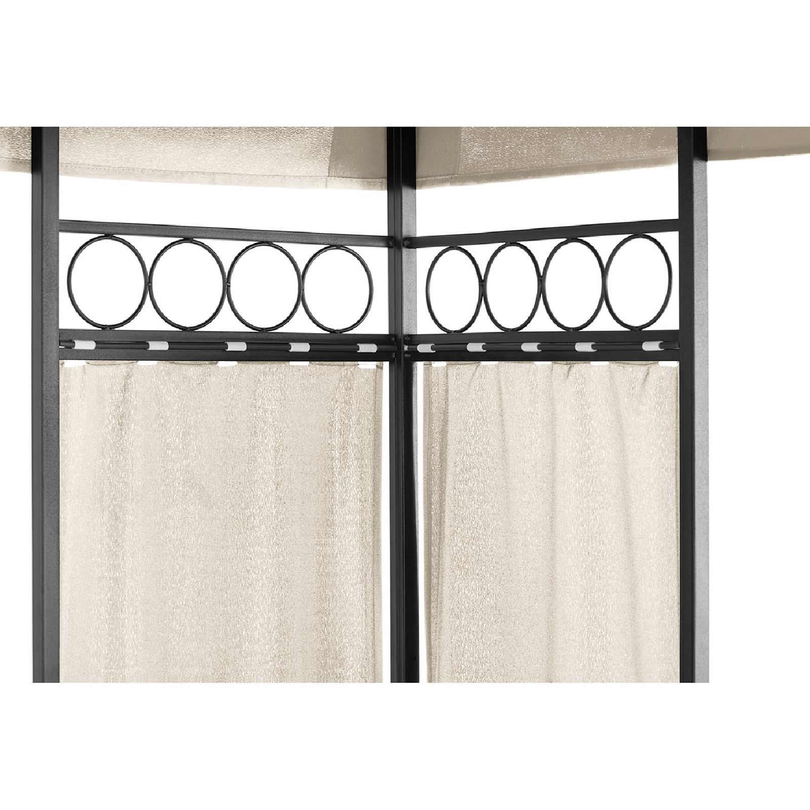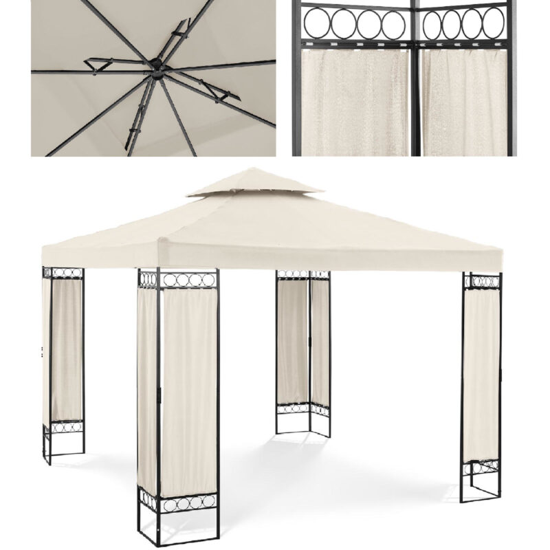 Namiot ma wymiary 3 x 3 x 2,6 m dzięki czemu pomieści wiele osób. Zadaszenie oraz poszycia boczne wykonane zostały z poliestru o gramaturze 160g/m2 co zapewnia im odporność na wszelkie warunki atmosferyczne. Konstrukcję wykonano ze stali zabezpieczonej farbą proszkową, gwarantującą odporność na uszkodzenia, rdzę czy łuszczenie. Montaż altanki jest prosty i nie zajmuje wiele czasu.