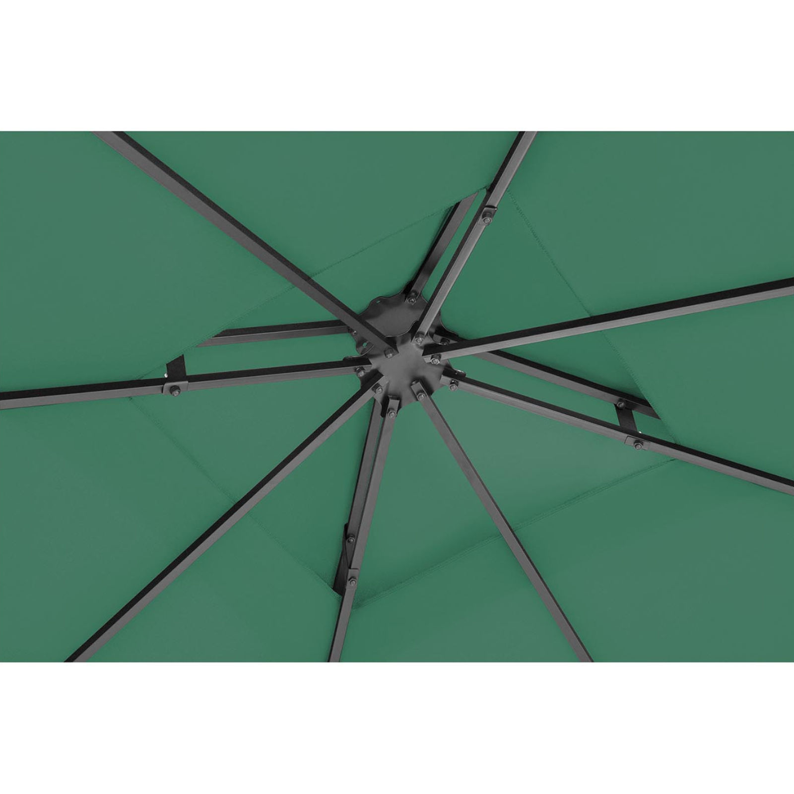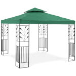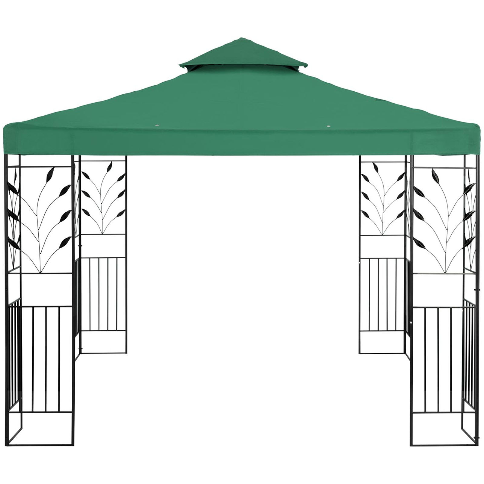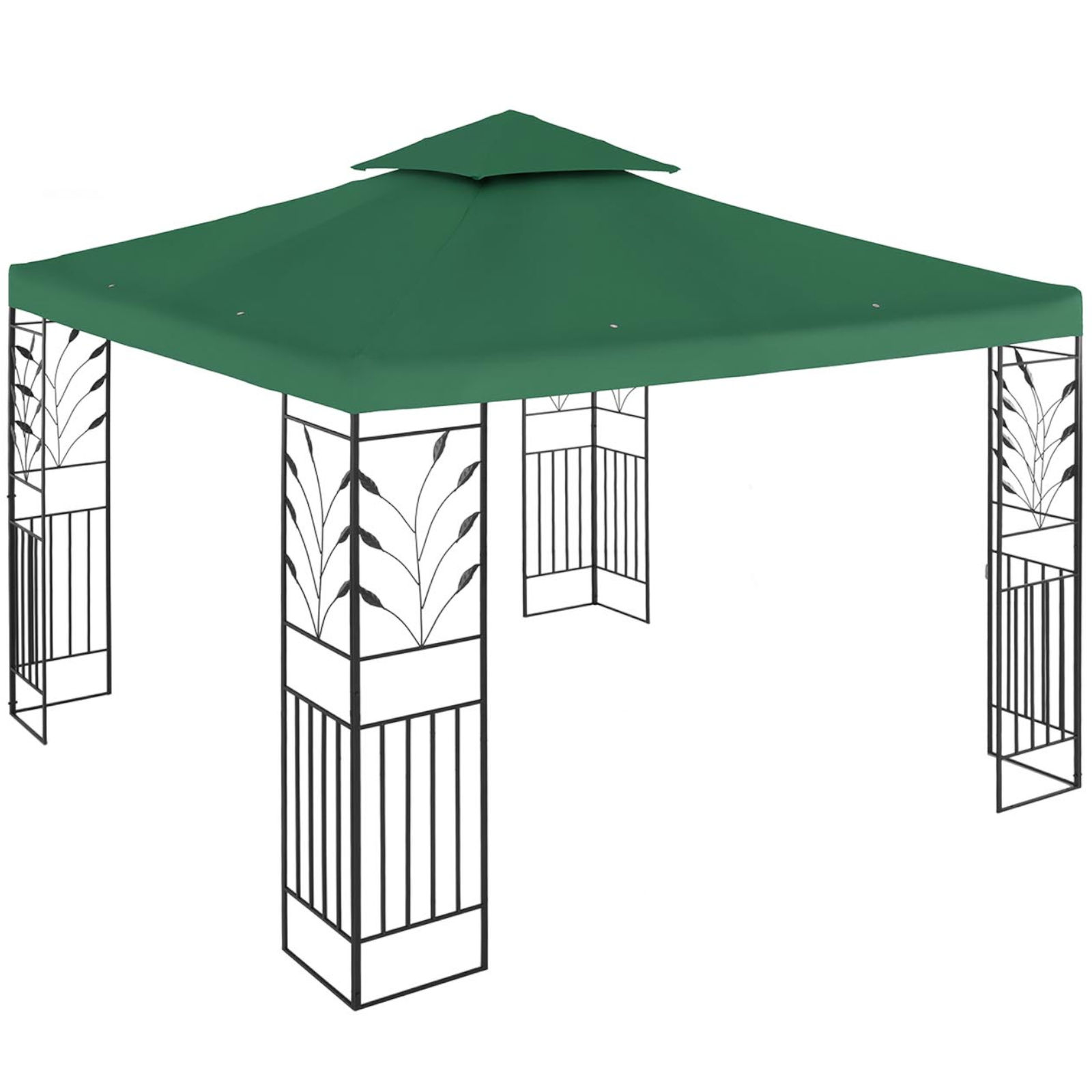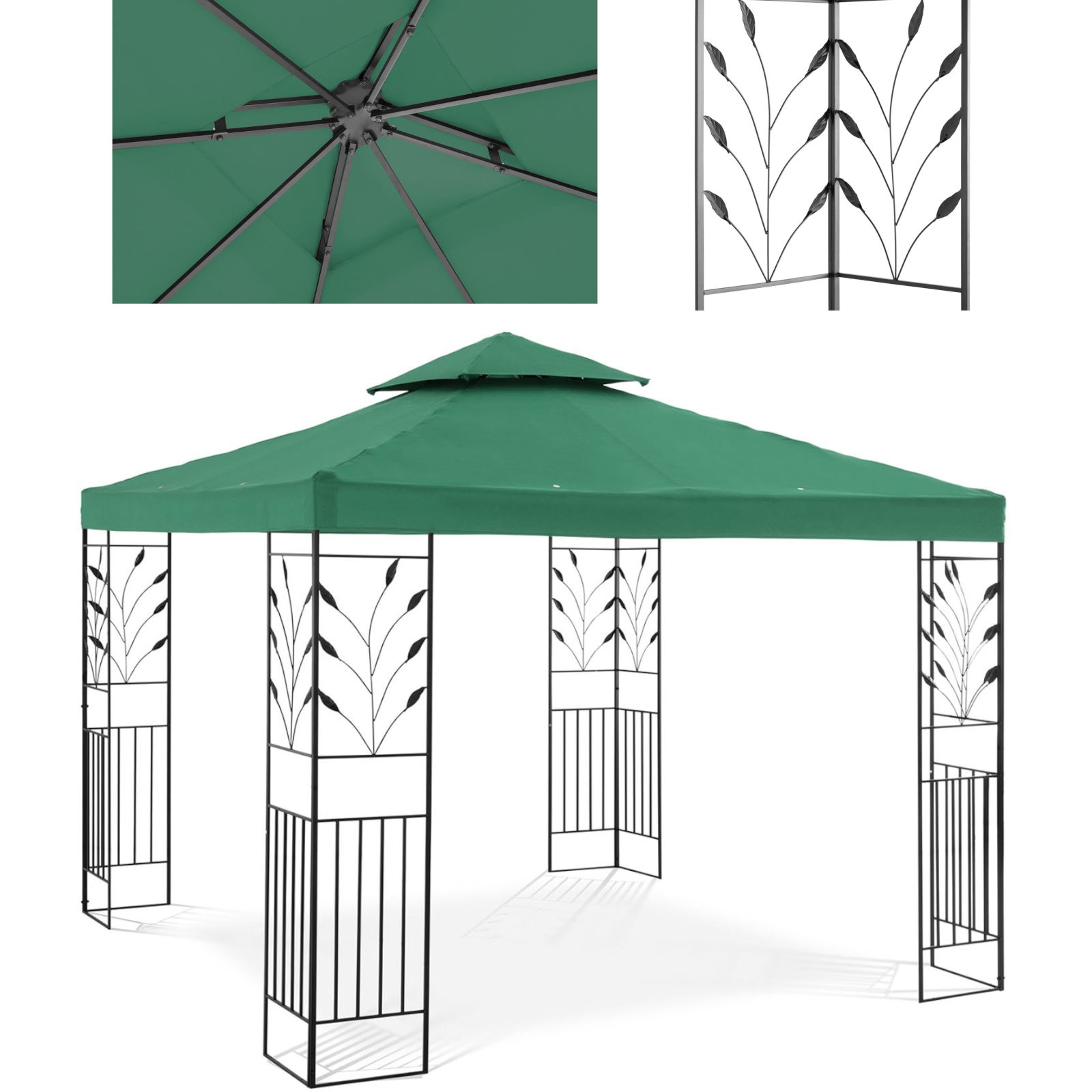 Namiot ma wymiary 3 x 3 x 2,6 m, dzięki czemu pomieści wiele osób. Zadaszenie z poliestru o gramaturze 180g/m2 nie przepuszcza szkodliwego promieniowania UV, chroni przed słońcem w upalny dzień. Atrakcyjny wygląd altany to zasługa roślinnego ornamentu. Konstrukcję wykonano z żelaza malowanego proszkowo, trwałego i odpornego na korozję. Stabilny szkielet jest bezpieczny, nie wymaga mocowania do podłoża.