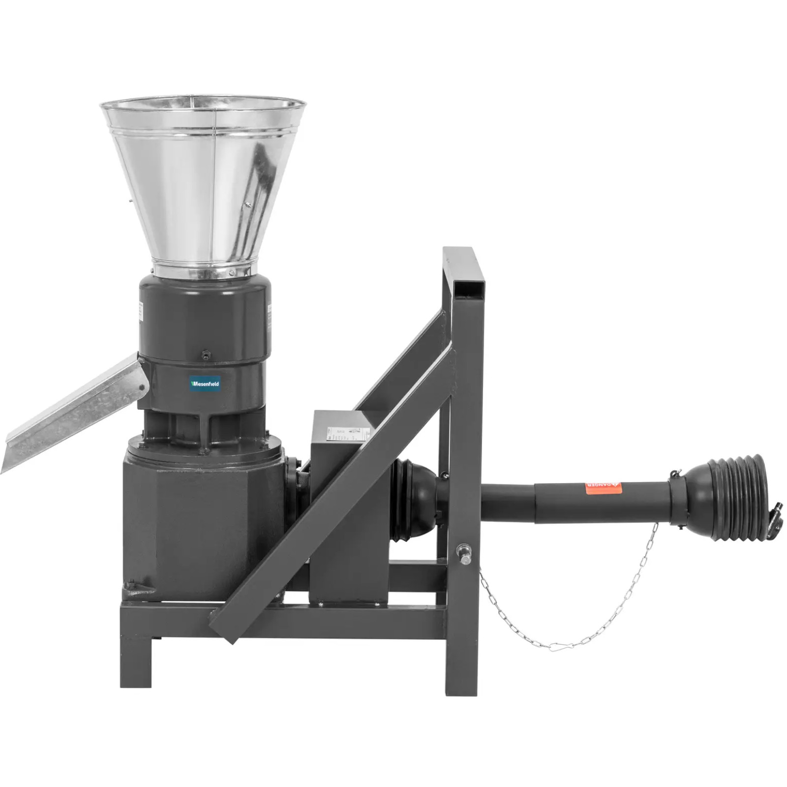 Peleciarka marki Wiesenfield pozwoli wyprodukować do 400 kg granulatu w ciągu godziny. Można też wytworzyć do 180 kg pelletu drzewnego z trocin na godzinę. Surowiec powinien być mniejszy niż 6 mm. Do napędzenia prasy do pelletu potrzebny jest ciągnik lub inny pojazd od 15 do 28 KM, który podłącza się do maszyny za pomocą wałka odbioru mocy (WOM). Dzięki czasowi pracy do 24 godzin z łatwością można wytworzyć nawet duże ilości granulatu. Panel sterujący jest przejrzysty i intuicyjny. O bezpieczeństwo zadba łatwo dostępny wyłącznik awaryjny – podobnie jak kratka ochronna w dużym leju do podawania materiału. Niezależnie od tego, czy chodzi o pellet drzewny, czy paszę, peleciarka pozwoli otrzymać łatwy do przechowania granulat. Prasa jest podgrzewana do temperatury od 60 do 80°C. Dwa solidne walce przeciskają materiał przez matrycę o średnicy 230 mm. W ten sposób otrzymuje się mocno sprasowany, trwały pellet o średnicy 6 mm. Do produkcji pelletu o innej średnicy potrzeba odpowiedniej matrycy. Praktyczna rynna wyładowcza pozwoli napełnić gotowy produkt bezpośrednio do worków. Uwaga: matryce i wałki dociskowe do peleciarek mogą być używane do 300 godzin. Jeśli są zużyte, należy je niezwłocznie wymienić.