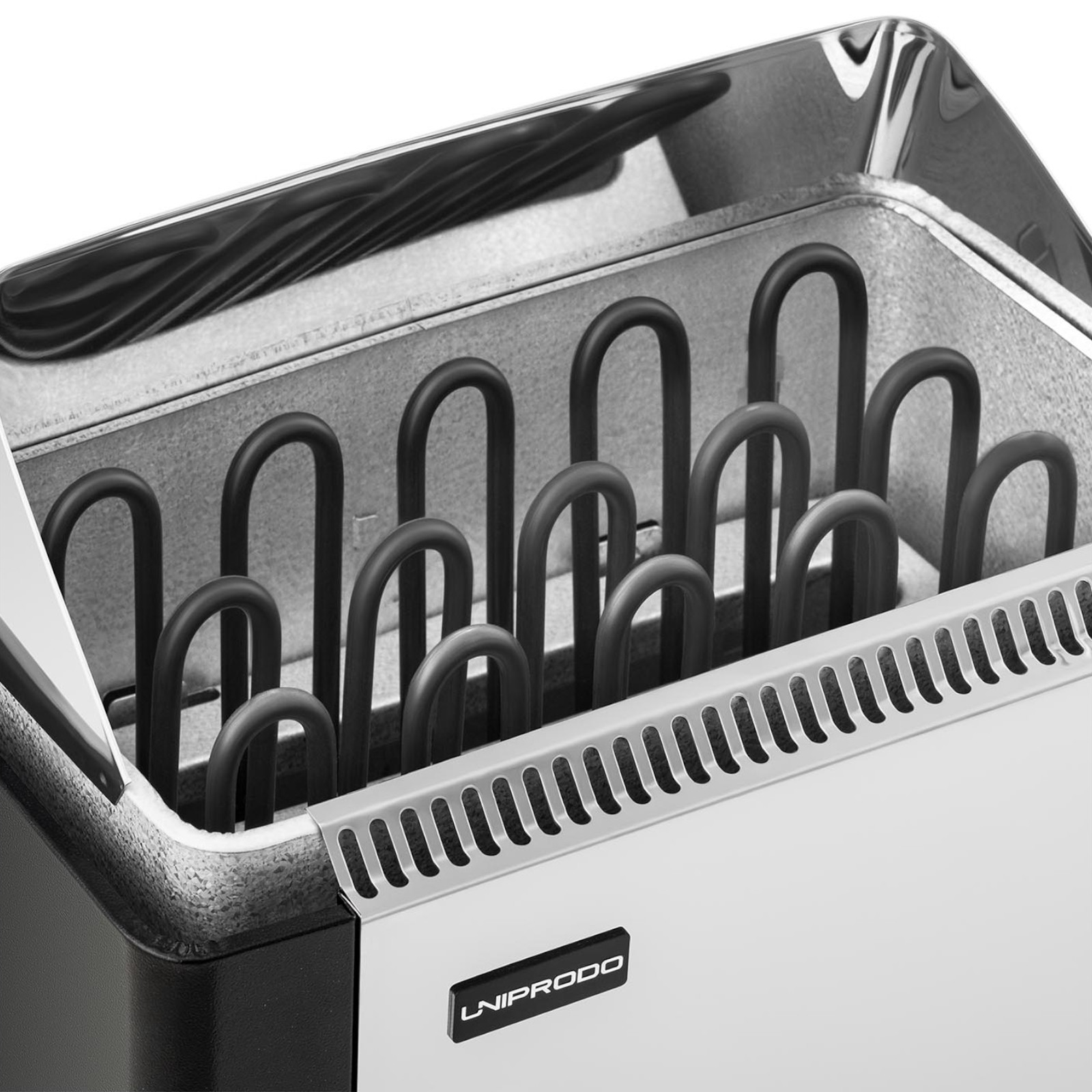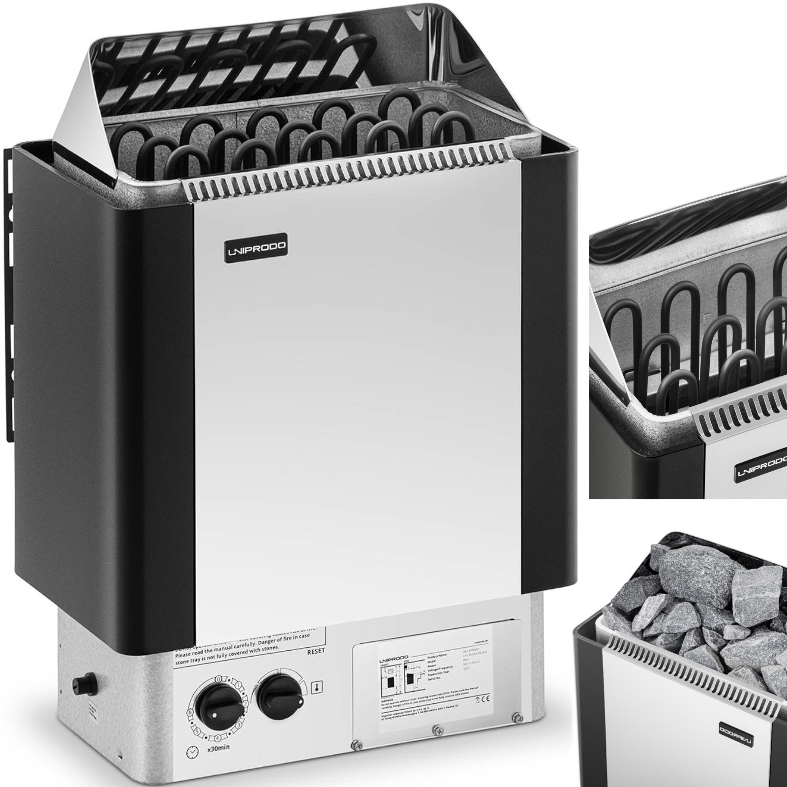 Piec do sauny marki Uniprodo sprawdzi się do pomieszczeń o wielkości 8-12 m3. Moc urządzenia wynosi 8 kW, co sprawdza się dla dedykowanej kubatury i pozwala osiągnąć temperaturę 110°C. Panel sterowania znajduje się na urządzeniu. Za jego pomocą można określić temperaturę oraz czas pracy. Urządzenie wykonane zostało z solidnych materiałów, cynku, aluminium i stali nierdzewnej, jest odporne na korozję i uszkodzenia mechaniczne. Piec jest wodoodporny, posiada klasę ochrony IPX4. Bezpiecznik uniemożliwia przegrzanie sprzętu.