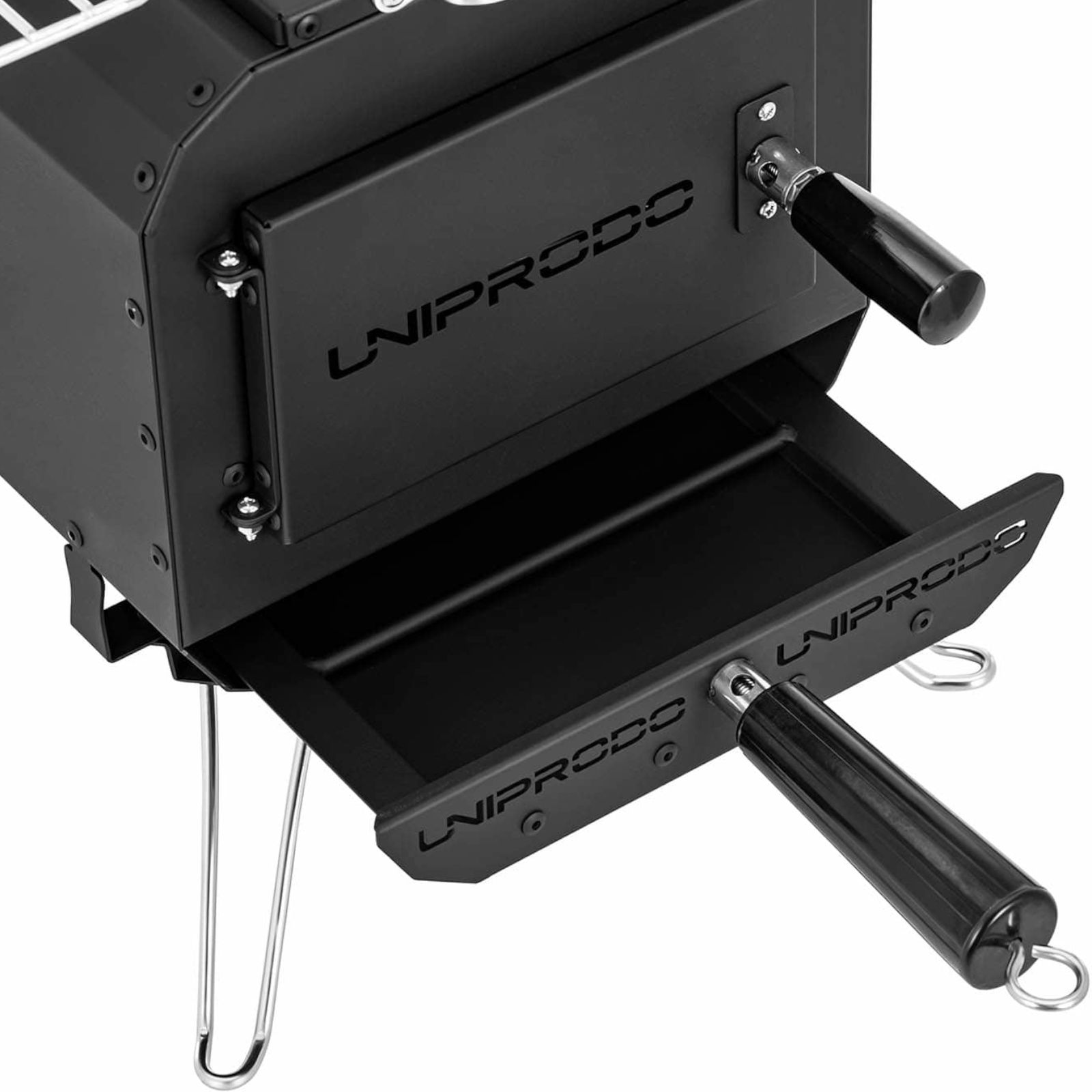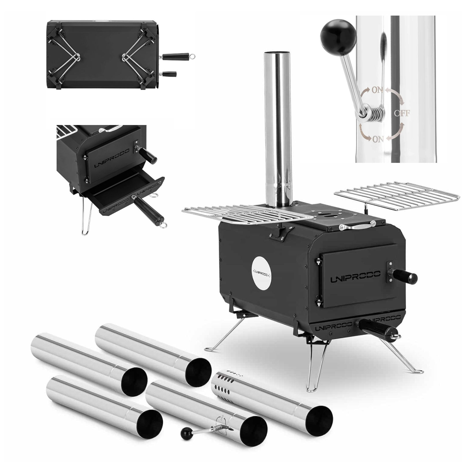 Piec namiotowy marki Uniprodo zapewnia ciepło i wprowadza przyjemną atmosferę w ogrodzie czy na kempingu. Piec posiada płaską powierzchnię, która umożliwia wygodne gotowanie na świeżym powietrzu. Opalany jest drewnem. Jego kompaktowa konstrukcja, odłączane części i składane nogi ułatwiają transport i przechowywanie. W komplecie znajduje się 6 rur kominowych do niezawodnego odprowadzania dymu. Piec posiada także osłonę przed iskrami oraz klapę do regulacji palenia. Wykonany został z wytrzymałej stali węglowej, jest odporny na korozję i bardzo dobrze przewodzi ciepło. Uszczelka zapewnia ciepło bez dymienia. Grubość materiału wynosi 1,2 m a komina 0,4 mm.