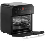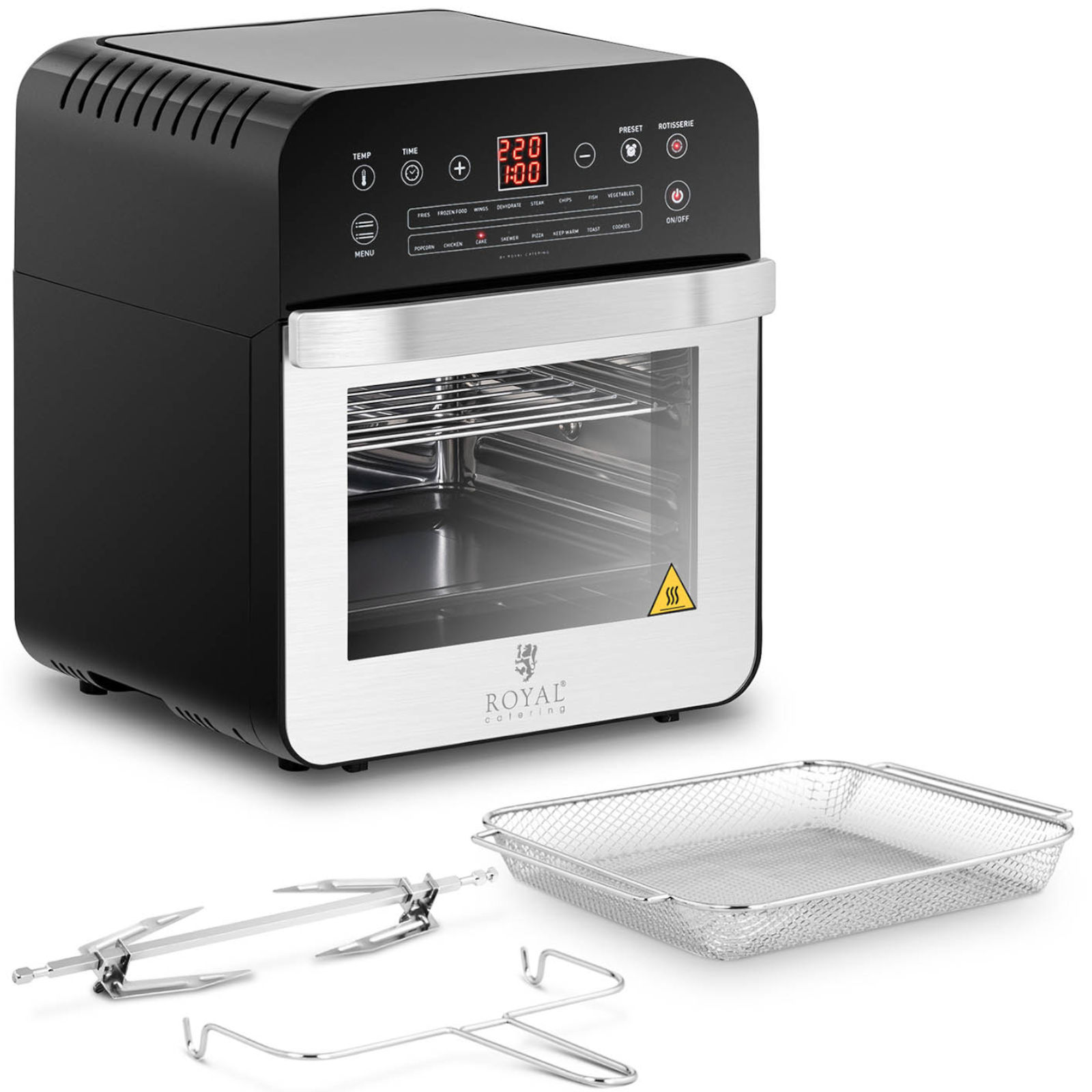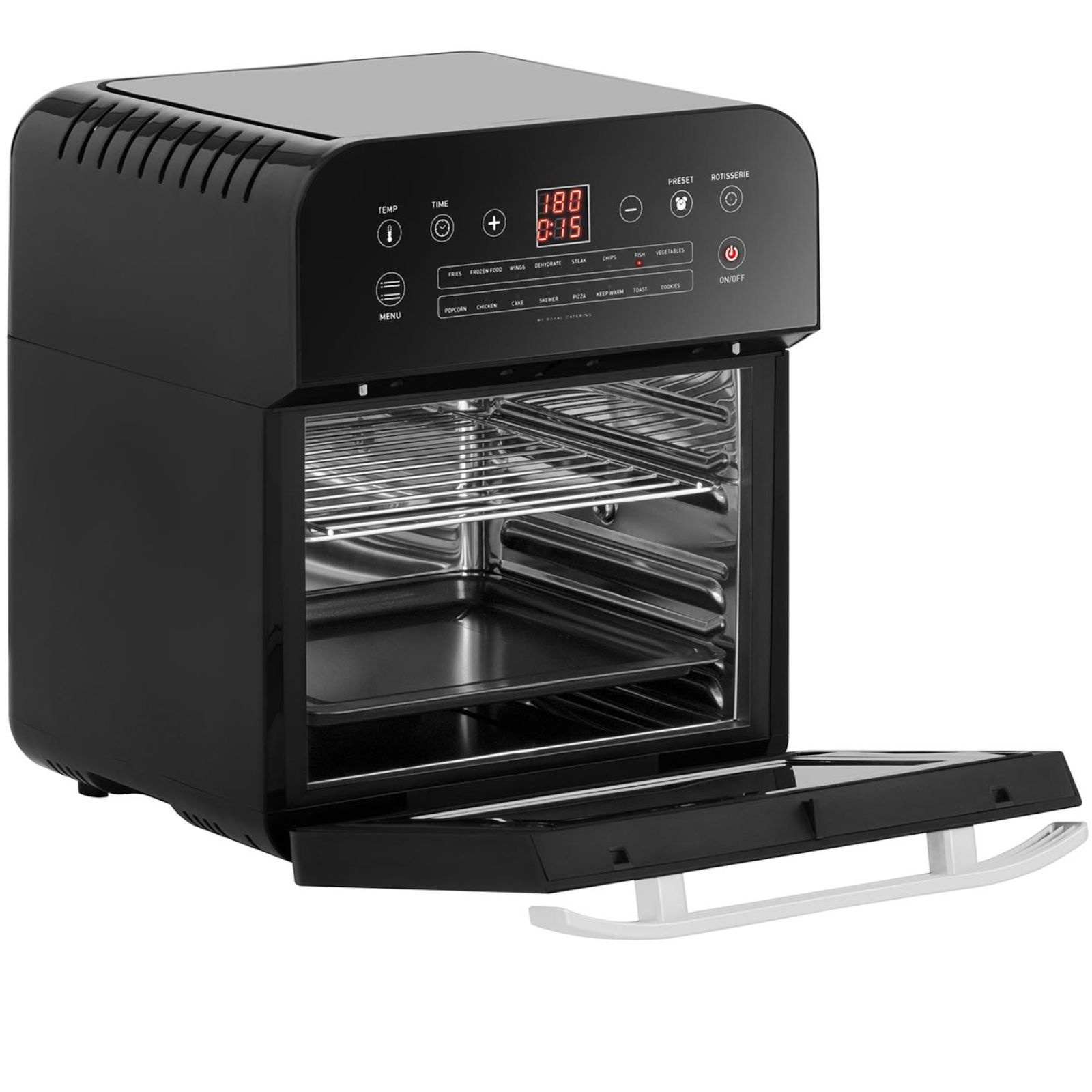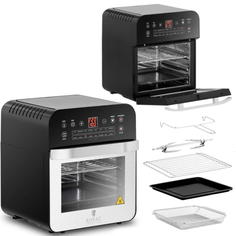 Piekarnik wielofunkcyjny marki Royal Catering to sprzęt zarówno dla gospodarstw domowych, jak i małych restauracji, barów szybkiej obsługi, bistro, stacji benzynowych itp. Piecyk o pojemności 12 l świetnie nadaje się do skrzydełek, zapiekanek, frytek i innych przekąsek. Wydajny piekarnik o dużej mocy 1600 W optymalnie wykorzystuje energię dzięki wentylatorowi oraz górnej grzałce. Łatwa obsługa to efekt wyposażenia w czytelny cyfrowy panel. Wyświetlacz LED pozwala na precyzyjne ustawienie parametrów. Timer działa w zakresie 0-60 minut, natomiast temperaturę ustawia się od 50 do 220°C. Piekarnik posiada 13 programów: do frytek, skrzydełek, steków, chipsów, ryb, warzyw, popcornu, kurczaka, ciasta, szaszłyków, pizzy, tostów i ciasteczek. Umożliwia także rozmrażanie, suszenie i utrzymywanie w cieple.