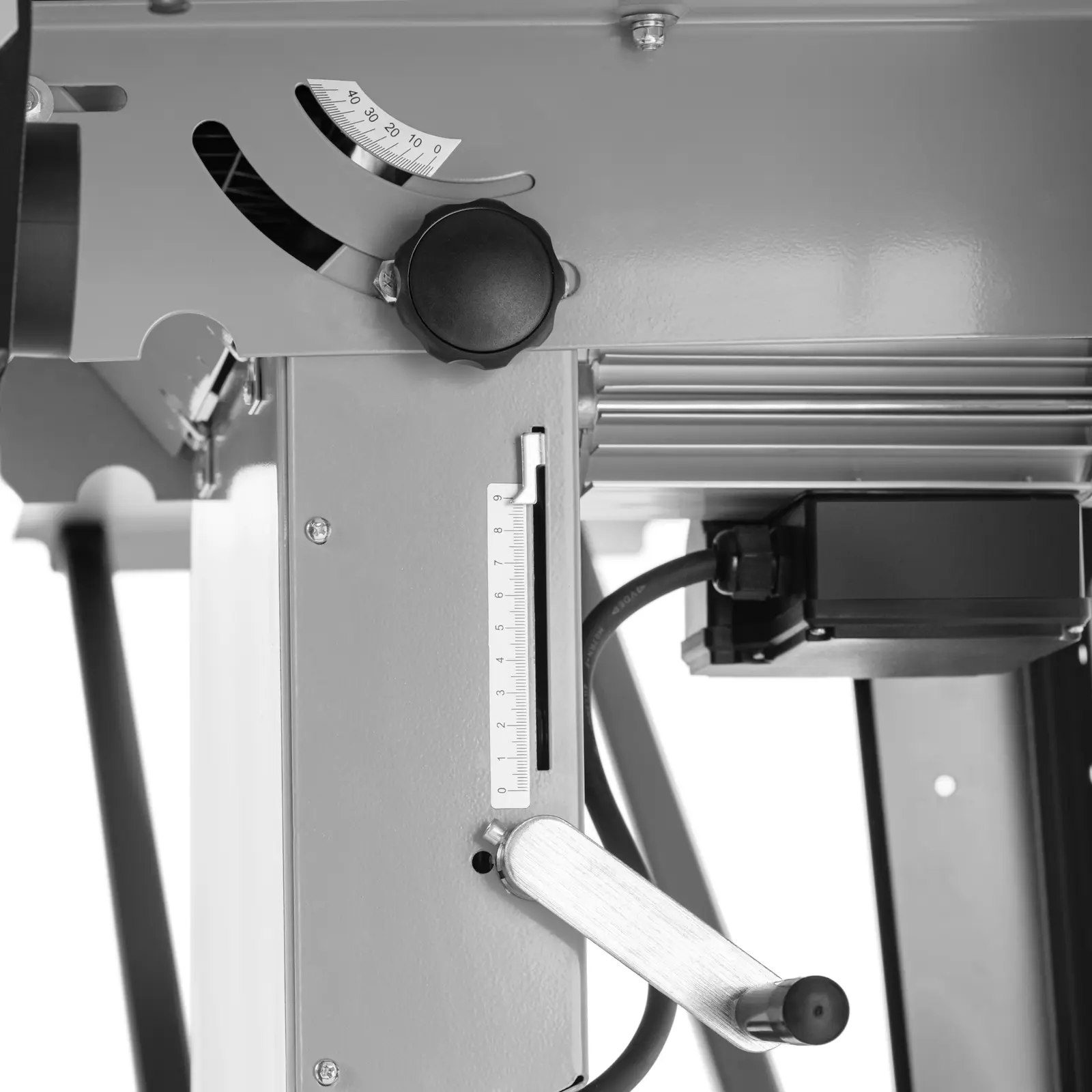 - – Bezstopniowa regulacja głębokości cięcia do 83 mm przy 90° i 49 mm przy 45° za pomocą ręcznej korby,