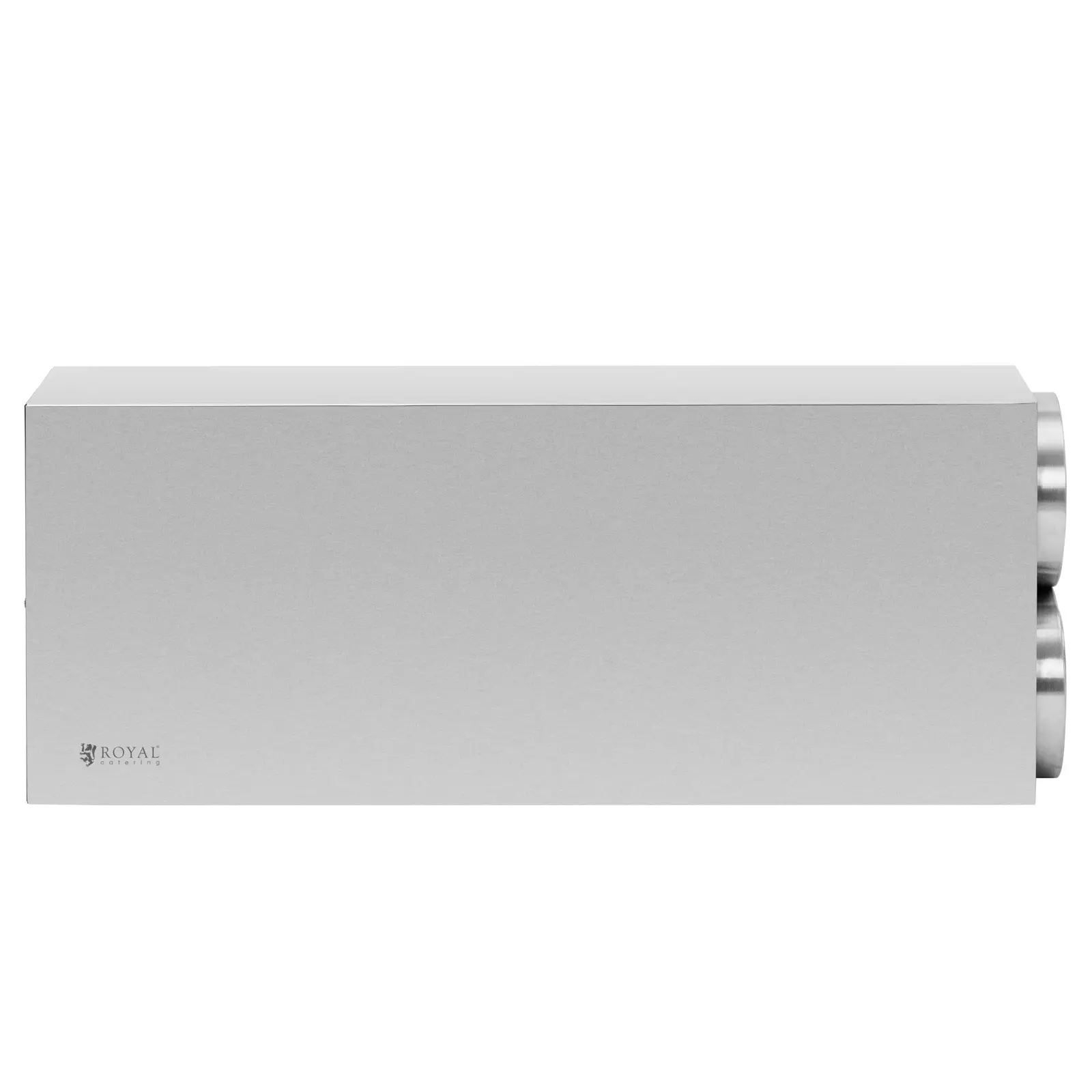 Podajnik do kubków jednorazowych marki Royal Catering z dwoma oddzielnymi otworami jest praktyczny i wszechstronny. Idealnie nadaje się do dużej liczby lub różnych rodzajów kubków jednorazowych. Dzięki przemyślanej konstrukcji bez problemu pomieści jednorazowe kubki o średnicach 81 – 89 cm. Praktyczna podwójna funkcja nie tylko ułatwia obsługę, ale także zapewnia sprawną organizację przy stanowiskach do kawy lub herbaty. Dodatkowo wyjmowanie i napełnianie kubków jest szybkie i wygodne. Podajnik harmonijnie wpasuje się w różne otoczenie i nadaje stacjom z napojami ekskluzywnego i nowoczesnego charakteru. Dzięki pionowej konstrukcji model wymaga niewielkiej powierzchni, co pozwala na optymalne wykorzystanie stanowiska z kawą. Taka oszczędność jest nie tylko dobra w małych przestrzeniach, ale pomaga też w utrzymaniu porządku w punktach z gorącymi napojami.