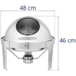 Podgrzewacz do potraw marki Royal Catering sprawdzi się do utrzymywania w cieple dużych ilości potraw i ich apetycznego wyeksponowania. Wykonany został ze stali nierdzewnej niewpływającej na smak jedzenia. Jego pojemność wynosi 5,8 l, co pozwala obsłużyć wiele osób jednocześnie na dużych imprezach. Pojemnik o wymiarach Ø390 x 70 mm łatwo wyjmuje się i napełnia świeżo ugotowaną zupą, sosem, chili con carne lub gulaszem warzywnym bezpośrednio z garnka. Podgrzewacz wykonany został z trwałej oraz odpornej na zarysowania stali nierdzewnej i spełnia wysokie wymagania higieniczne branży gastronomicznej. Posiada nienagrzewającą się rączkę, która pozwala na obsługę bez ryzyka oparzenia. Pokrywkę termoizolacyjna wyposażono w szklane okienko. Pokrywę rolowaną łatwo unieść, aby wyjąć i nałożyć jedzenie. Pojemnik na paliwo można wygodnie wyjąć spod naczynia i napełnić specjalną pastą. Zbiornik wyposażony jest w pokrywkę ułatwiającą gaszenie płomienia. Pastę paliwową w pojemniku umieszcza się pod dnem naczynia na wodę o wymiarach Ø380 x 110 mm. Wydajne podgrzewanie pojemnika gwarantuje optymalne rozprowadzanie ciepła, utrzymując wysoką temperaturę, aromat i świeżość podawanych dań nawet przez kilka godzin. Woda służy również jako bufor zapobiegający przypalaniu żywności. Gorąca woda utrzymuje ciepło, nawet po zgaszeniu płomienia paliwa. Całe urządzenie można łatwo rozłożyć na części w celu wyczyszczenia i przechowania.