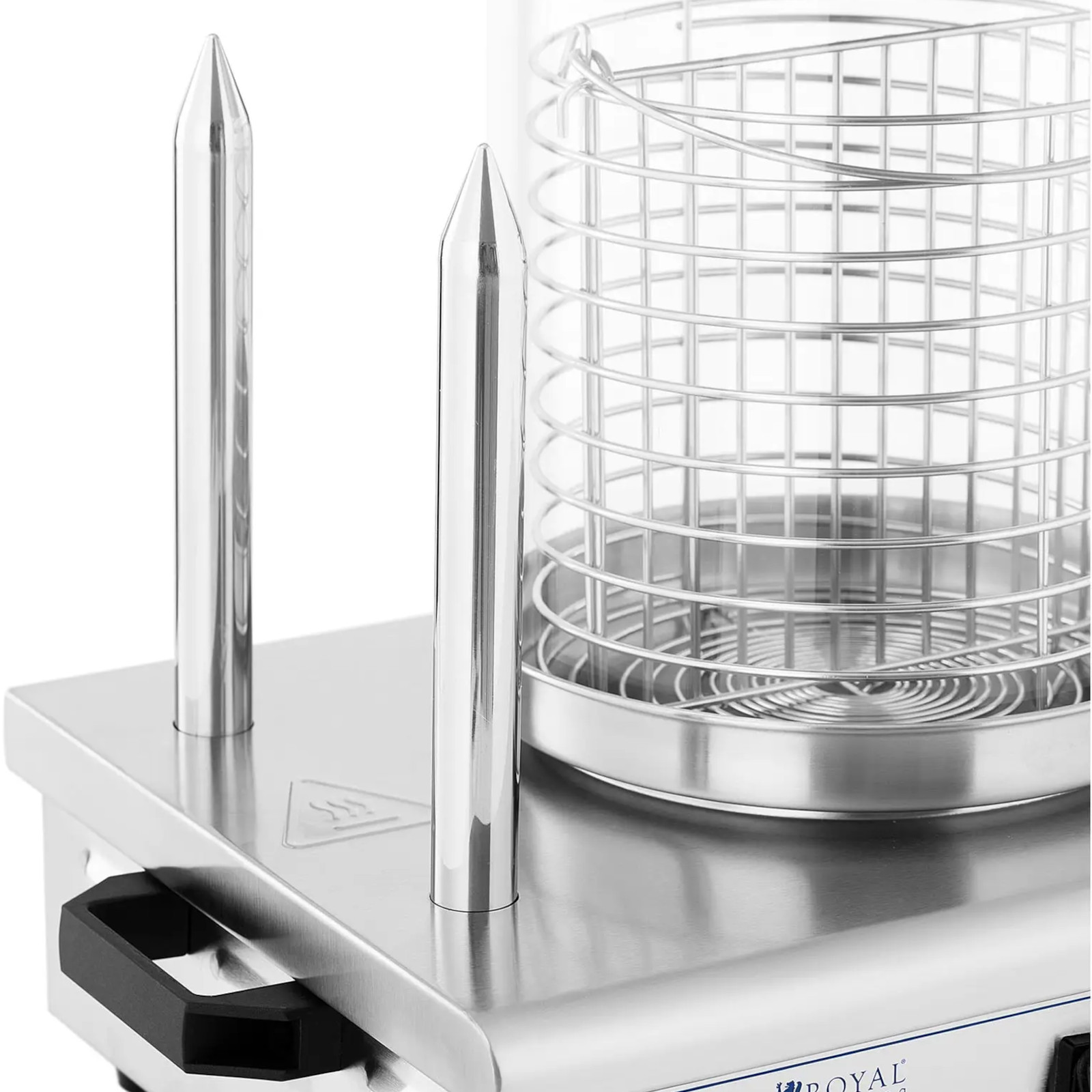 Podgrzewacz do hot dogów marki Royal Catering sprawdzi się w restauracji, w barze z przekąskami, na stoisku gastronomicznym, stacji benzynowej, w food trucku czy w cateringu. Pozwala szybko i skutecznie podgrzać kiełbaski oraz bułki na pyszne hot dogi, ale także utrzymuje je ciepłe przez wiele godzin. W przestronnym szklanym pojemniku 0,7 l można delikatnie podgrzać i utrzymać w cieple przez długi czas bez pękania do 30 kiełbasek. Bułki można jednocześnie opiekać na 2 rozgrzanych szpikulcach. Pojemnik na parówki i szpikulce pracują niezależnie od siebie w energooszczędny sposób. Włącza i wyłącza się je intuicyjnie za pomocą przełącznika. Wysoka moc 550 W oraz szeroki zakres temperatury 37-100°C umożliwiają szybki i wydajny proces ogrzewania. Lampka kontrolna pokazuje, kiedy sprzęt się nagrzewa i kiedy osiągnięta została ustawiona temperatura. Urządzenie zostało wykonane z wysokiej jakości stali nierdzewnej, idealnej do pracy z żywnością. Szklany pojemnik jest szczególnie wytrzymały i znosi wysokie temperatury. Podgrzewacz do hot dogów jest bezpieczny i łatwy w użyciu. Po obu stronach znajdują się poręczne uchwyty. Pokrywę pojemnika na parówki można otwierać i zamykać równie bezpiecznie dzięki izolowanemu termicznie uchwytowi. Urządzenie dzięki kompaktowej konstrukcji łatwo jest transportować i przechowywać.