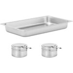 Podgrzewacz do potraw marki Royal Catering sprawdzi się w hotelowych bufetach oraz na imprezach z cateringiem. Wykonany został ze stali nierdzewnej, trwałej i nie reagującej w kontakcie z żywnością. Pokrywa rolowana z tworzywa sztucznego jest przezroczysta, co pozwala wyeksponować zawartość podgrzewacza. Bemar ma dużą pojemność 8,5 l. Wyposażony został w wyjmowany pojemnik GN 1/1 o głębokości 65 mm. Podgrzewacz zasilany jest specjalną pastą. W komplecie znajdują się dwa pojemniki z pokrywkami ułatwiającymi gaszenie płomienia. Pojemniki z pastą umieszcza się pod dnem naczynia na wodę 570 x 365 x 100 mm. Gorąca woda utrzymuje potrawy w cieple i zapobiega ich przypaleniu.