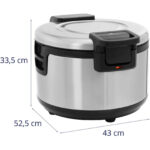 Podgrzewacz do ryżu marki Royal Catering posiada pojemność 19 l. Podziałka wewnątrz pozwala łatwo porcjować ryż. Moc 110 W umożliwia szybkie osiągnięcie temperatury roboczej 68/72°C i utrzymywanie w cieple. Obudowa i pokrywa urządzenia wykonane zostały ze stali nierdzewnej, rękojeść i regulator z tworzywa sztucznego. Wnętrze aluminiowego urządzenia jest pokryte nieprzywierającą powłoką i można ją wyjąć. W zestawie znajduje się łyżka do porcjowania ryżu.