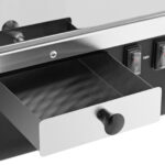 Podgrzewacz marki Royal Catering pozwala przechowywać 99 l chrupiących nachos gotowych do podania. Jego atrakcyjny wygląd to zasługa szklanej komory i dobrego oświetlenia. Wygląd dobrze komponuje się z maszyną do popcornu i dozownikiem sosów z tej samej serii. Szklane drzwi z tyłu pozwalają łatwo napełnić urządzenie. Zintegrowana lampa grzewcza utrzymuje równomierne ciepło przekąsek takich jak nachos, popcorn czy orzeszki ziemne. Maszyna wykonana została z wytrzymałej stali nierdzewnej, stali walcowanej na zimno i szkła. Wbudowana szuflada pozwala na łatwe usunięcie zebranych resztek i okruchów.