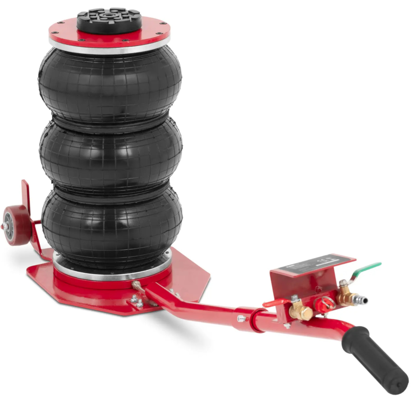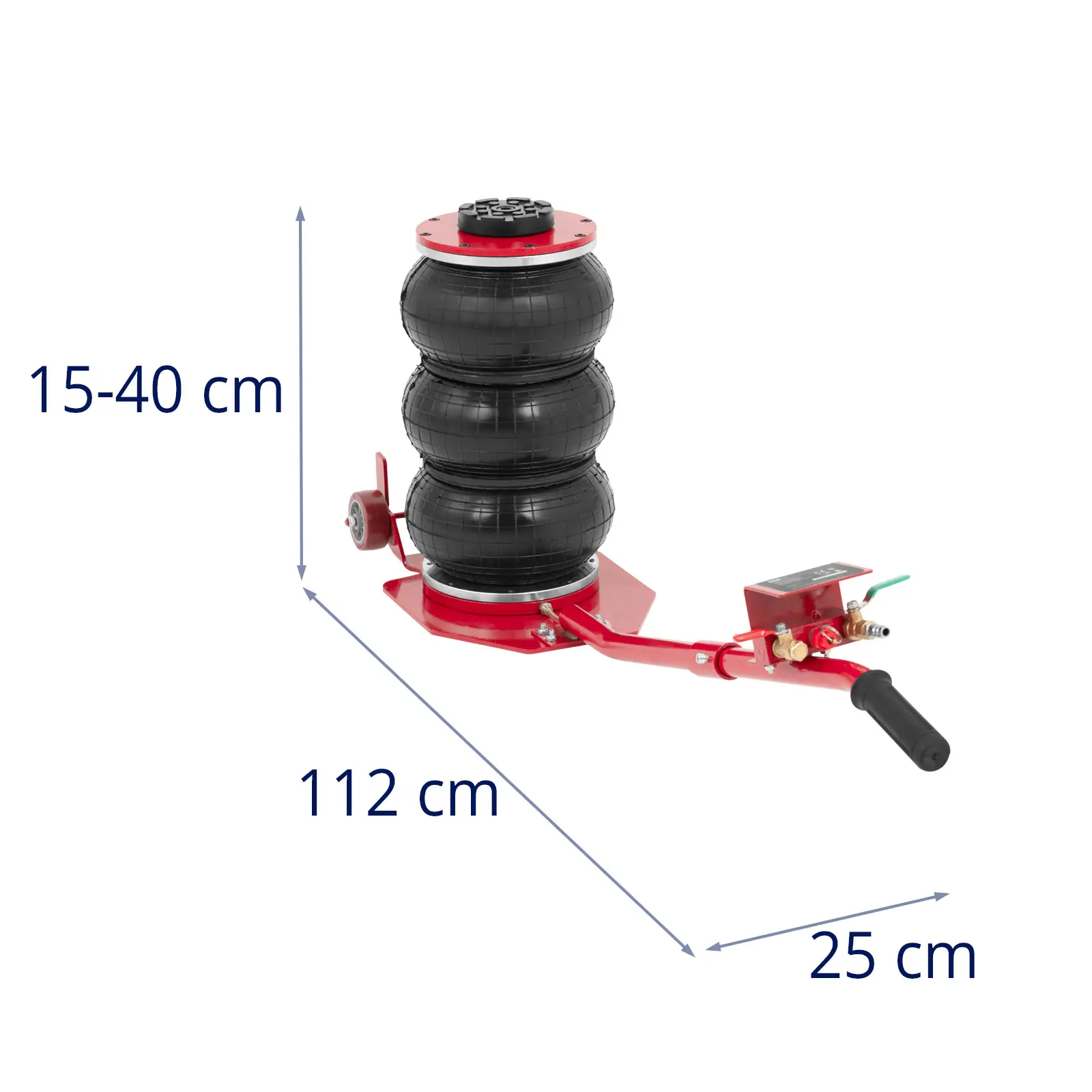 Podnośnik samochodowy pneumatyczny marki MSW dzięki złączu Euro jest gotowy do natychmiastowego podnoszenia pojazdów za pomocą sprężonego powietrza. Kompaktowa konstrukcja sprawia, że podnośnik bałwanek jest niezwykle wszechstronny, dzięki czemu szybko i bezpośrednio można wykorzystać go w warsztacie. Ciśnienie robocze od 5 do 10 barów umożliwia łatwe unoszenie pojazdów o masie do 3000 kg. Trzy gumowe poduszki powietrzne osiągają wysokość podnoszenia 40 cm w zaledwie pięć sekund. Podnośnik pneumatyczny jest stabilizowany przez wysuwany wspornik wewnętrzny. Zawór przeciążeniowy zapewnia dodatkowe bezpieczeństwo. Dzięki dwóm kółkom i długiemu uchwytowi można ustawić podnośnik w optymalnej pozycji. Gumowana podkładka o średnicy 10 cm ochroni pojazd przed zarysowaniami podczas podnoszenia. Poduszki pneumatyczne są nie tylko mocne, ale także odporne na rozdarcia i zapobiegają zarysowaniom podczas manewrowania. Duża powierzchnia podstawy zapewnia niezbędną stabilność. Dzięki kompaktowej konstrukcji i dużym kołom z łatwością można wykorzystać niezwykle zwrotny podnośnik pneumatyczny w swoim warsztacie.