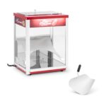 Podgrzewacz do nachos marki Royal Catering sprawdzi się do przechowywania w cieple do 45 l chrupiących przekąsek gotowych do podania. Urządzenie zostało zaprojektowane do użytku komercyjnego w kinach, kawiarniach, fast foodach czy bistrach. Podgrzewacz posiada szklany front i oświetlenia LED, co atrakcyjnie prezentuje produkty. Komorę łatwo napełnić od góry smakołykami. Wyjmuje się je równie łatwo i w precyzyjnych porcjach za pomocą dołączonej szufelki. Lampa Grzewcza osiąga temperaturę 55°C, utrzymując ciepło nachosów czy popcornu. Wnętrze urządzenia wykonane zostało ze stali nierdzewnej, korpus jest stalowy a front z hartowanego szkła. Antypoślizgowe nóżki zapewniają stabilność maszynie.