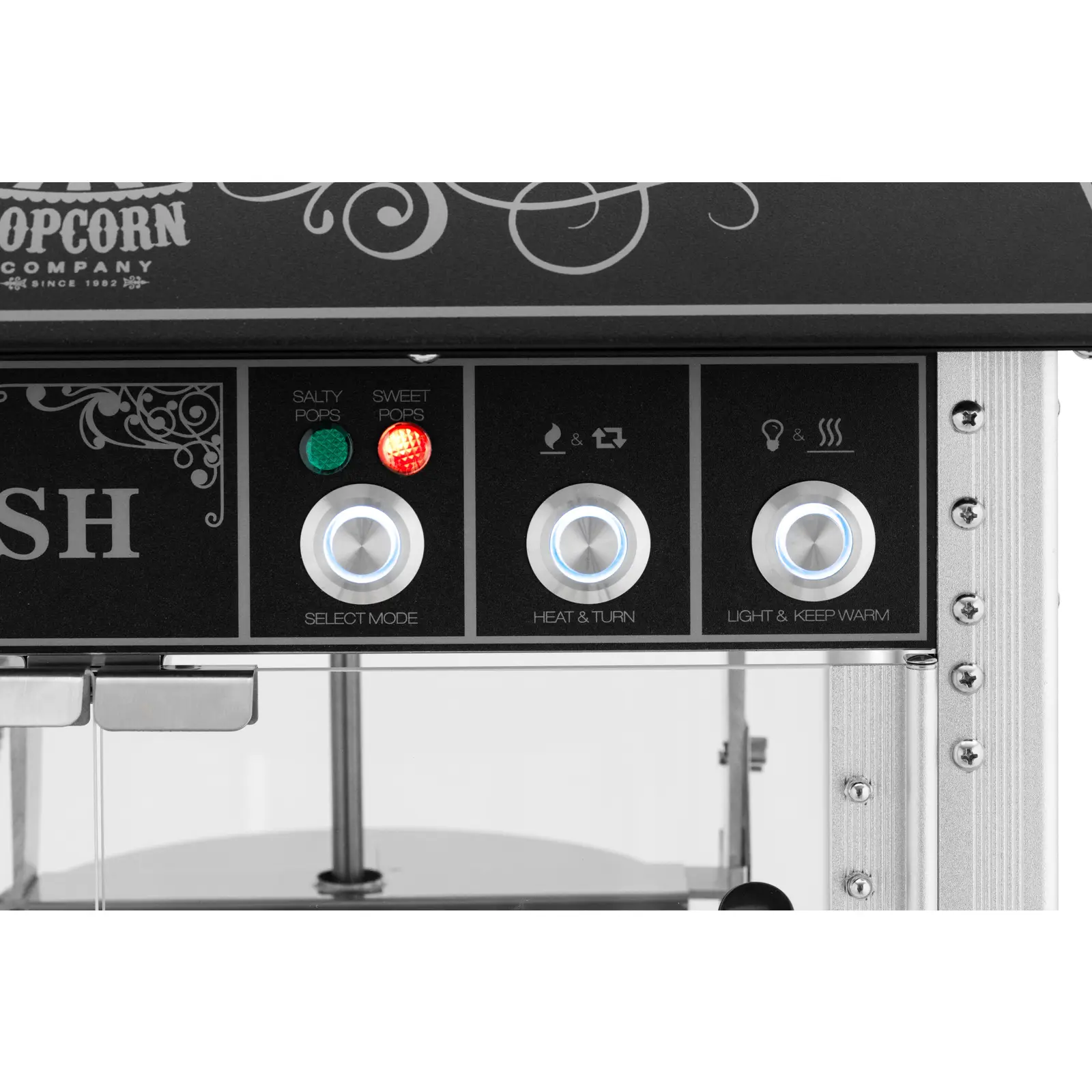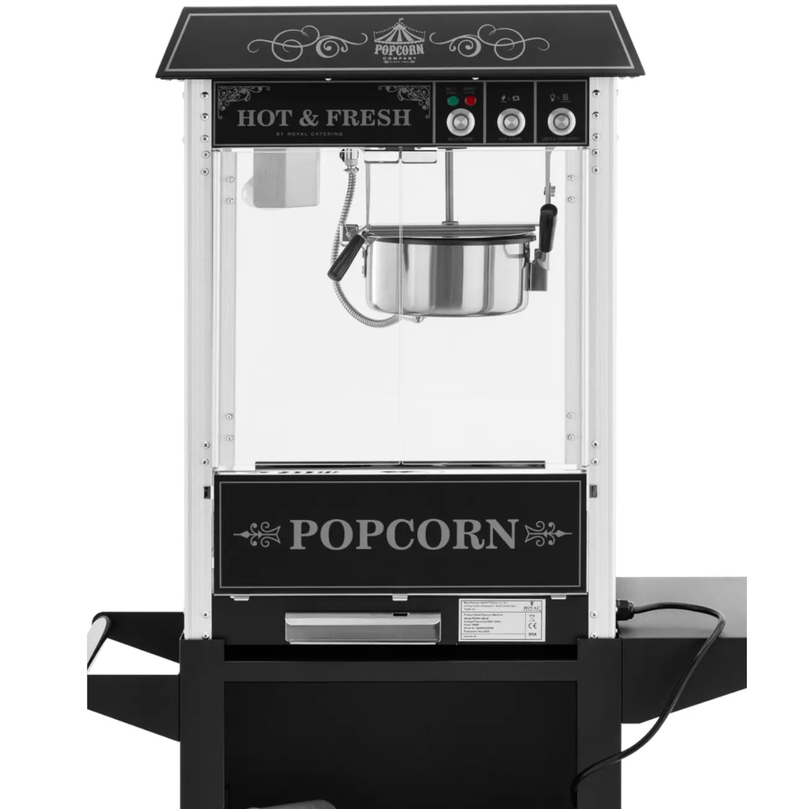 Maszyna do popcornu marki Royal Catering sprawdzi się podczas imprez plenerowych, festynów czy w kinach pod chmurką. Jej radosny design z czarnym emaliowanym dachem to prawdziwy hit. Posiada też podgrzewaną i podświetlaną komorę, system mieszania oraz automatyczny termostat. Duża moc 1600 W sprawia, że szybko osiąga temperaturę roboczą. Mocny silnik zapewnia dokładne rozprowadzanie ciepła wewnątrz maszyny, dzięki czemu ziarna nagrzewają się i równomiernie pękają. Wydajność urządzenia wynosi do 16 litrów popcornu na godzinę (ok. 5 – 6 kg/godz.). Jest więc idealne do użytku komercyjnego do szybkiego zapewniania przekąsek dużej klienteli. Maszyna pracuje z 2 różnymi temperaturami. Do popcornu z cukrem stosuj niższą temperaturę 150°C, a do klasycznego popcornu zalecamy temperaturę 180°C. To sprawia, że urządzenie do popcornu szczególnie dobrze nadaje się do barów z przekąskami w kinie, na wszelkiego rodzaju imprezach lub na dużych festynach. Oto jak uzyskasz chrupiący popcorn: używaj oleju kokosowego, ponieważ wytrzymuje temperaturę do 240°C bez spalania. Garnek jest pokryty teflonem, który jest łatwy w czyszczeniu a popcorn nie przypala się. Zmniejsza to koszty i sprawia, że przekąski są lżejsze, ponieważ do kukurydzy potrzeba mniej oleju. Garnek ma również mieszadło, które obraca się na minimalnej wysokości nad dnem, mieszając ziarna w środku. Tryb mieszania włączany jest osobnym przyciskiem. Garnek ma średnicę 18.5 cm i głębokość 5.8 cm. Opróżniany jest z łatwością za pomocą poręcznej plastikowej rączki. Lekka pokrywa garnka utrzymuje temperaturę wewnątrz a po przechyleniu gotowa kukurydza łatwo wysypuje się do dolnej komory maszyny. Aby wyczyścić garnek, wystarczy go wyjąć z kabiny. Maszyna jest łatwa w utrzymaniu, wykonana została z wysokiej jakości stali nierdzewnej i hartowanego szkła. Dzięki temu jest bardzo wytrzymałe i bezpieczne dla żywności. Wózek do maszyny posiada dwa duże koła i dwa małe skrętne kółka 360° z hamulcami postojowymi. Praktyczna dolna szafka oferuje dużo miejsca, np. na dołączone przybory, takie jak szufelka i poręczna miarka. Pozwala też przechować składniki, w tym ziarna kukurydzy, olej, sól i przyprawy. Estetyczny wygląd wózka przykuwa uwagę klientów i wizualnie uatrakcyjnia stanowisko z przekąskami. Oprócz funkcji utrzymywania ciepła, maszyna do popcornu posiada również podświetlaną komorę. Duża komora jest otwierana przez przezroczyste drzwiczki z magnetycznym zamknięciem. Zamknięcie bezpiecznie utrzymuje lekki popcorn w środku, a jednocześnie umożliwia szybkie otwieranie przy niewielkim wysiłku. Popcorn można wyjąć jeszcze szybciej i bez otwierania drzwiczek dzięki uchylnej szufladzie pod komorą.