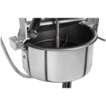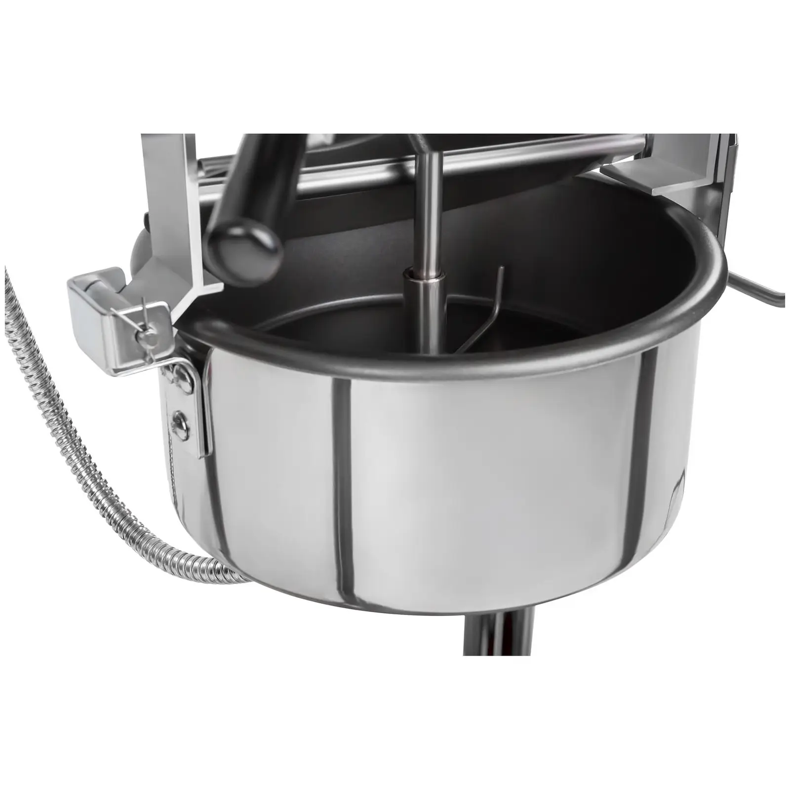 Maszyna do popcornu marki Royal Catering sprawdzi się na festynach, przyjęciach czy imprezach okolicznościowych. Stanowi atrakcyjne stanowisko o ponadczasowym wyglądzie retro. Posiada podgrzewaną i podświetlaną komorę, system mieszania oraz automatyczny termostat. Urządzenie pracuje z mocą 1600 W i szybko osiąga temperaturę roboczą. Mocny silnik zapewnia dokładne rozprowadzanie ciepła wewnątrz maszyny, dzięki czemu ziarna nagrzewają się i równomiernie pękają. Urządzenie pozwala wyprodukować 16 l popcornu na godzinę (ok. 5 – 6 kg/godz.). Jest więc idealne do użytku komercyjnego. Maszyna pracuje z 2 różnymi temperaturami, umożliwiając przyrządzanie smakołyku na słono i słodko. Do popcornu z cukrem należy stosować niższą temperaturę 150°C, a do klasycznego popcornu temperaturę 180°C. Aby uzyskać chrupiący popcorn: należy używać oleju kokosowego, ponieważ wytrzymuje temperaturę do 240°C bez spalania. Garnek jest pokryty teflonem, dzięki czemu popcorn nie przypala się. Garnek ma również mieszadło, które obraca się na minimalnej wysokości nad dnem, mieszając ziarna w środku. Tryb mieszania włącza się osobnym przyciskiem. Garnek ma średnicę 18.5 cm i głębokość 5.8 cm. Opróżniany jest z łatwością za pomocą poręcznej plastikowej rączki. Lekka pokrywa garnka utrzymuje temperaturę wewnątrz i zapewnia, że po przechyleniu gotowa kukurydza łatwo wysypuje się do dolnej komory maszyny. Aby wyczyścić garnek, wystarczy go wyjąć z kabiny. Maszyna jest łatwa w utrzymaniu, została wykonana z wysokiej jakości stali nierdzewnej i hartowanego szkła. Dzięki temu urządzenie jest bardzo wytrzymałe i bezpieczne dla żywności. Wózek do maszyny ma dwa duże koła i dwa małe skrętne kółka 360° z hamulcami postojowymi. Praktyczna dolna szafka oferuje dużo miejsca, np. na dołączone przybory. Estetyczny wygląd wózka przykuwa uwagę klientów i wizualnie uatrakcyjnia stanowisko z przekąskami. Duża komora jest otwierana przez przezroczyste drzwiczki z magnetycznym zamknięciem. Zamknięcie bezpiecznie utrzymuje lekki popcorn w środku, a jednocześnie umożliwia szybkie otwieranie przy niewielkim wysiłku. Popcorn można wyjąć jeszcze szybciej i bez otwierania drzwiczek dzięki uchylnej szufladzie pod komorą.