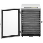 Suszarka posiada moc 800 W, dzięki czemu szybko osiąga temperaturę roboczą 20-90°C. Regulacja mocy odbywa się za pomocą cyfrowego panelu. Timer pozwala na bezobsługową pracę do 24 godzin. Duża pojemność komory pozwana na jednoczesne suszenie dużej ilości produktów, które można rozmieścić na 12 ażurowych rusztach wykonanych ze stali nierdzewnej. Obudowa urządzenia także została wykonana ze stali nierdzewnej, która cechuje się dużą odpornością. 4 silikonowe maty odpowiadają za nieprzywieranie produktów do tacek, pozwalają wysuszyć wilgotne owoce typu banany, truskawki.