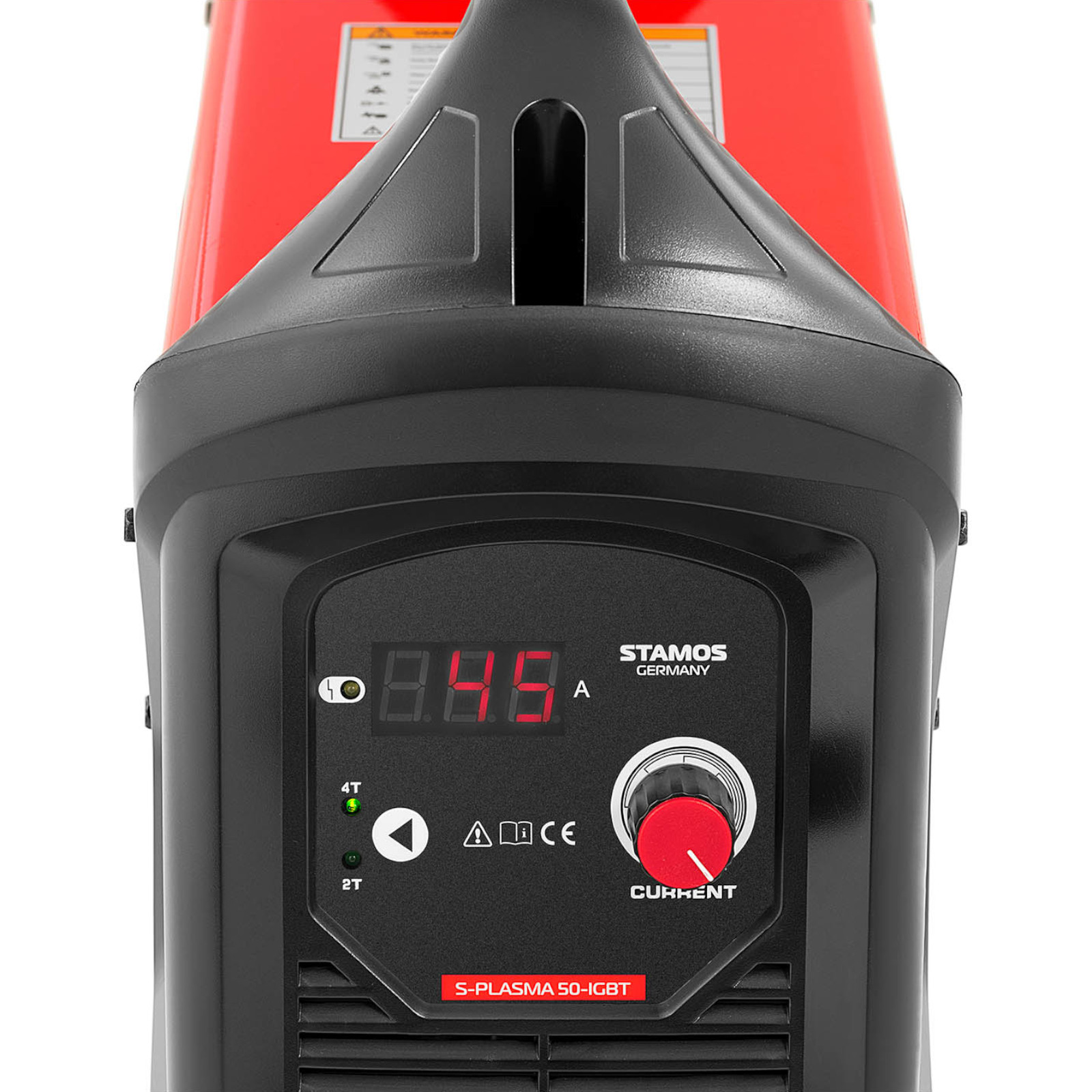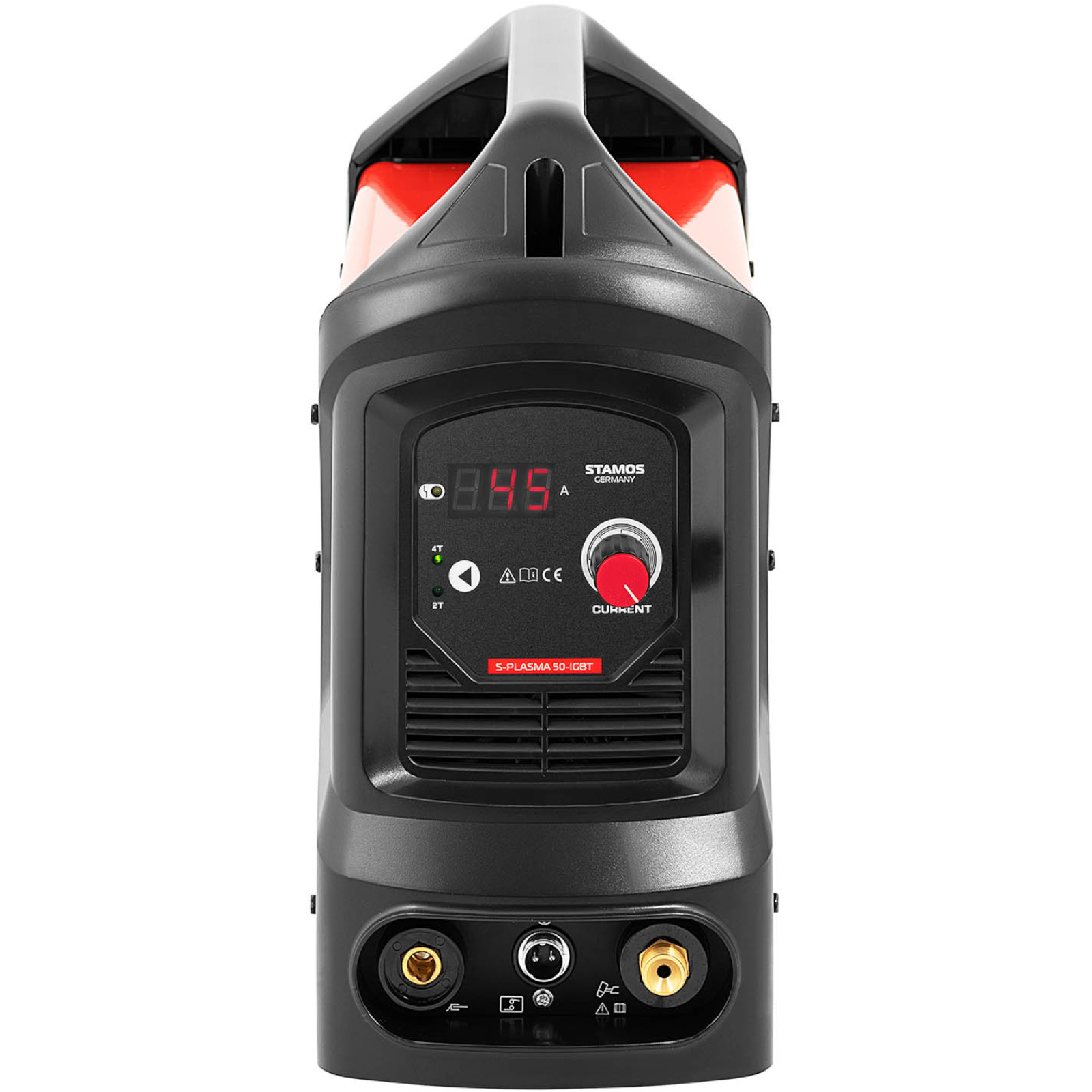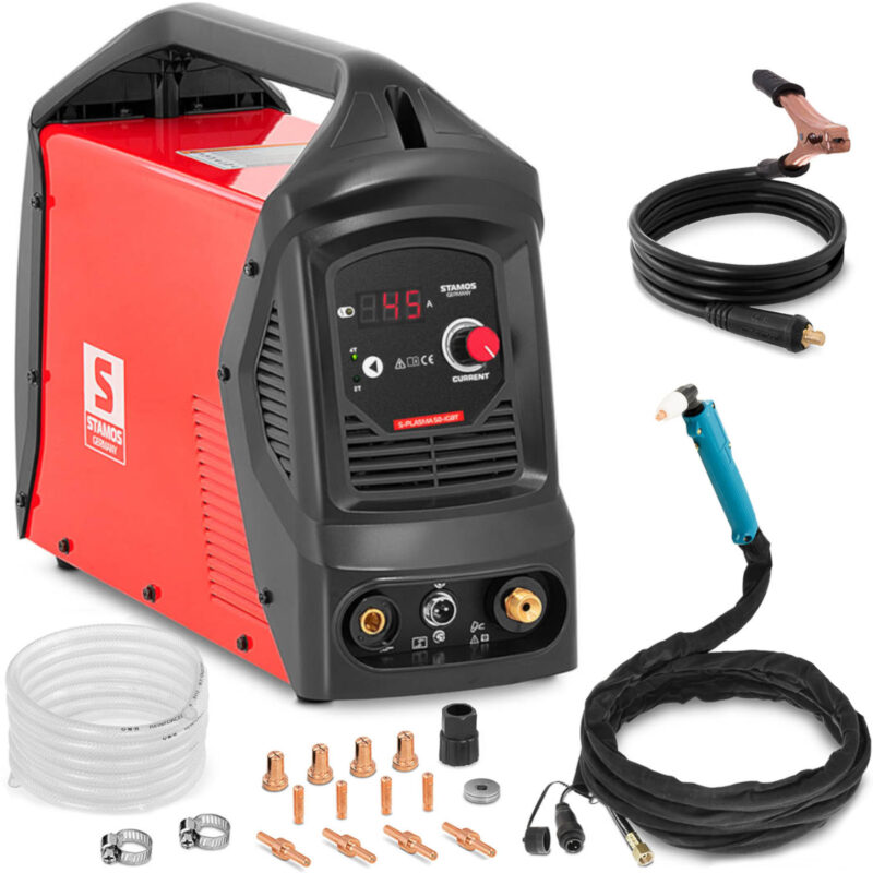 Przecinarka plazmowa marki Stamos Germany sprawdzi się w warsztatach samochodowych, firmach zajmujących się obróbką metali, a także wśród majsterkowiczów. Doskonale radzi sobie ze stalą, stalą nierdzewną, żeliwem, miedzią, niklem, tytanem czy aluminium. Urządzenie jest precyzyjne i nie powoduje deformacji. Prąd ciecia ustawiany jest za pomocą pokrętła w zakresie 20-45 A. Wyświetlacz LED pozwala monitorować wybrane parametry. Przy cyklu pracy 100% możliwe są 20 A. Wystarcza to do przecięcia detali o grubości do 15 mm. Urządzenie posiada 2 tryby pracy, w trybie 2T palnik pracuje tak długo jak wciśnięty jest włącznik, w trybie 4T należy dotknąć raz, by włączyć palnik i dotknąć ponownie by go wyłączyć. Palnik zapala się z wysoką częstotliwością, co pozwoli oddzielić kratki i ruszty. Dopływ powietrza przez 10 s zapobiega utlenianiu i deformacji przedmiotu. Ponieważ powietrze nadal przepływa, palnik się chłodzi zapobiegając uszkodzeniu. Wydajny wentylator zapobiega przegrzaniu. Stalowa obudowa chroni elementy i zabezpiecza je przed wpływami środowiska. Uchwyt pomaga w bezpiecznym transporcie.
