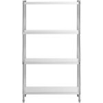 Regał magazynowy marki Royal Catering przyda się w każdym pomieszczeniu magazynowym. Wykonany ze stali nierdzewnej o wymiarach 100 x 40 x 180 cm i nośności każdej półki do 50 kg, regał nadaje się do kuchni gastronomicznych. Na 4 półkach można przechowywać wiele przyborów jednocześnie. Konstrukcja jest stabilna i trwała, dodatkowo łatwa w pielęgnacji, ponadto spełni najwyższe standardy gastronomiczne, więc jest odpowiedni do kontaktu z żywnością. Srebrny kolor nadaje meblowi elegancki wygląd i można go stosować w restauracjach, hotelach jak i przestrzeniach prywatnych, a jego montaż jest bardzo łatwy i nie wymaga dodatkowych narzędzi.