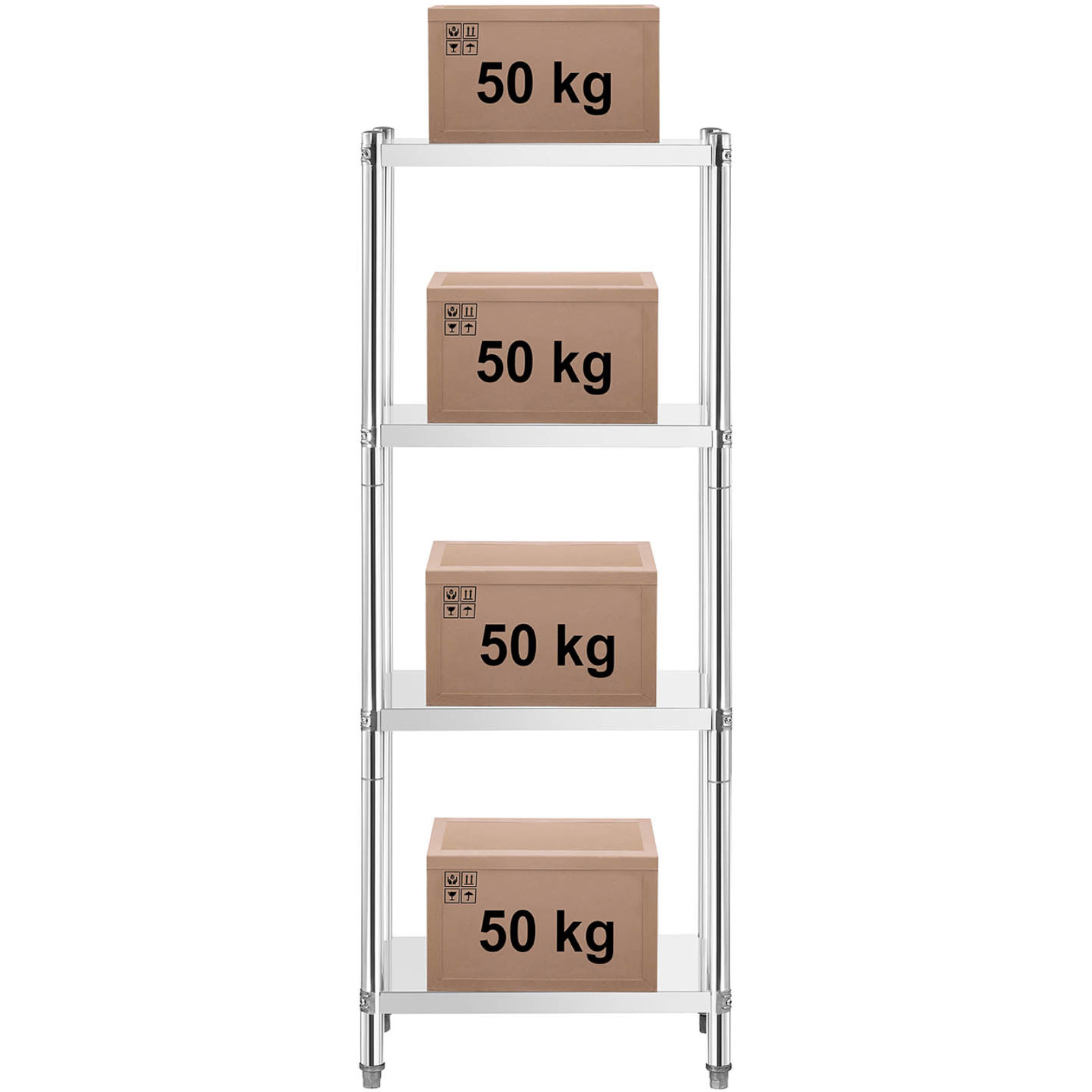 Regał magazynowy marki Royal Catering przyda się w każdym pomieszczeniu magazynowym. Wykonany ze stali nierdzewnej o wymiarach 70 x 40 x 180 cm i nośności każdej półki do 50 kg, regał nadaje się do kuchni gastronomicznych. Na 4 półkach można przechowywać wiele przyborów jednocześnie. Konstrukcja jest stabilna i trwała, dodatkowo łatwa w pielęgnacji, ponadto spełni najwyższe standardy gastronomiczne, więc jest odpowiedni do kontaktu z żywnością. Srebrny kolor nadaje meblowi elegancki wygląd i można go stosować w restauracjach, hotelach jak i przestrzeniach prywatnych, a jego montaż jest bardzo łatwy i nie wymaga dodatkowych narzędzi.