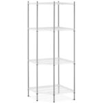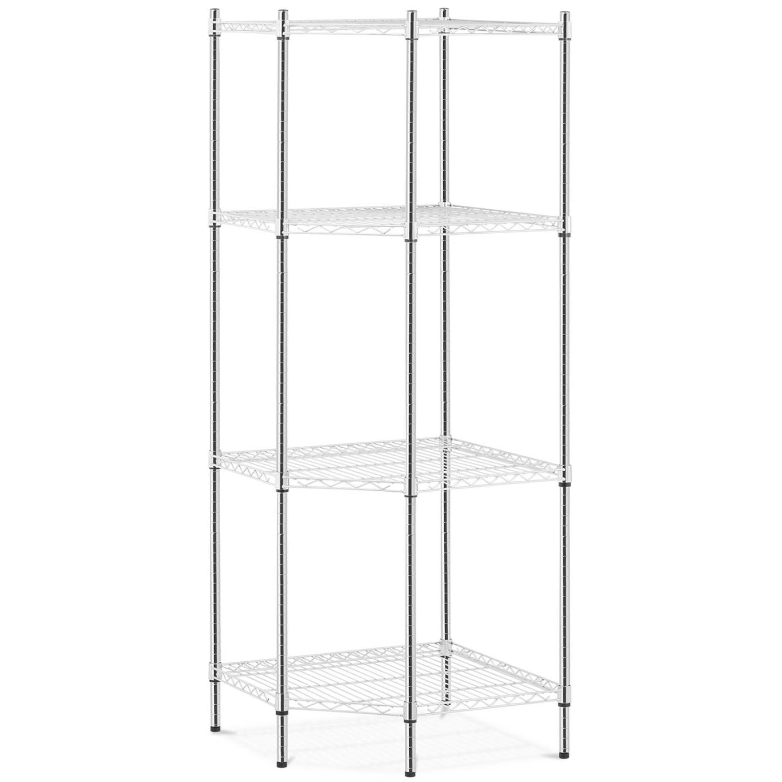 Regał druciany narożny posiada 4 półki o rozmiarach 680 x 680 mm a każda z nich jest w stanie wytrzymać obciążenie do 250 kg. Solidne słupki o wysokości 180 cm i średnicy 25 mm zapewniają całości stabilność. Konstrukcję wykonano z trwałej i estetycznej stali węglowej co zapewnia wieloletnie użytkowanie. Otwarte półki umożliwiają dojście do regału z każdej strony. Montaż mebla jest łatwy a niezbędne akcesoria dostarczone są w komplecie.