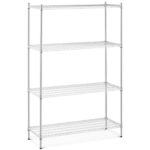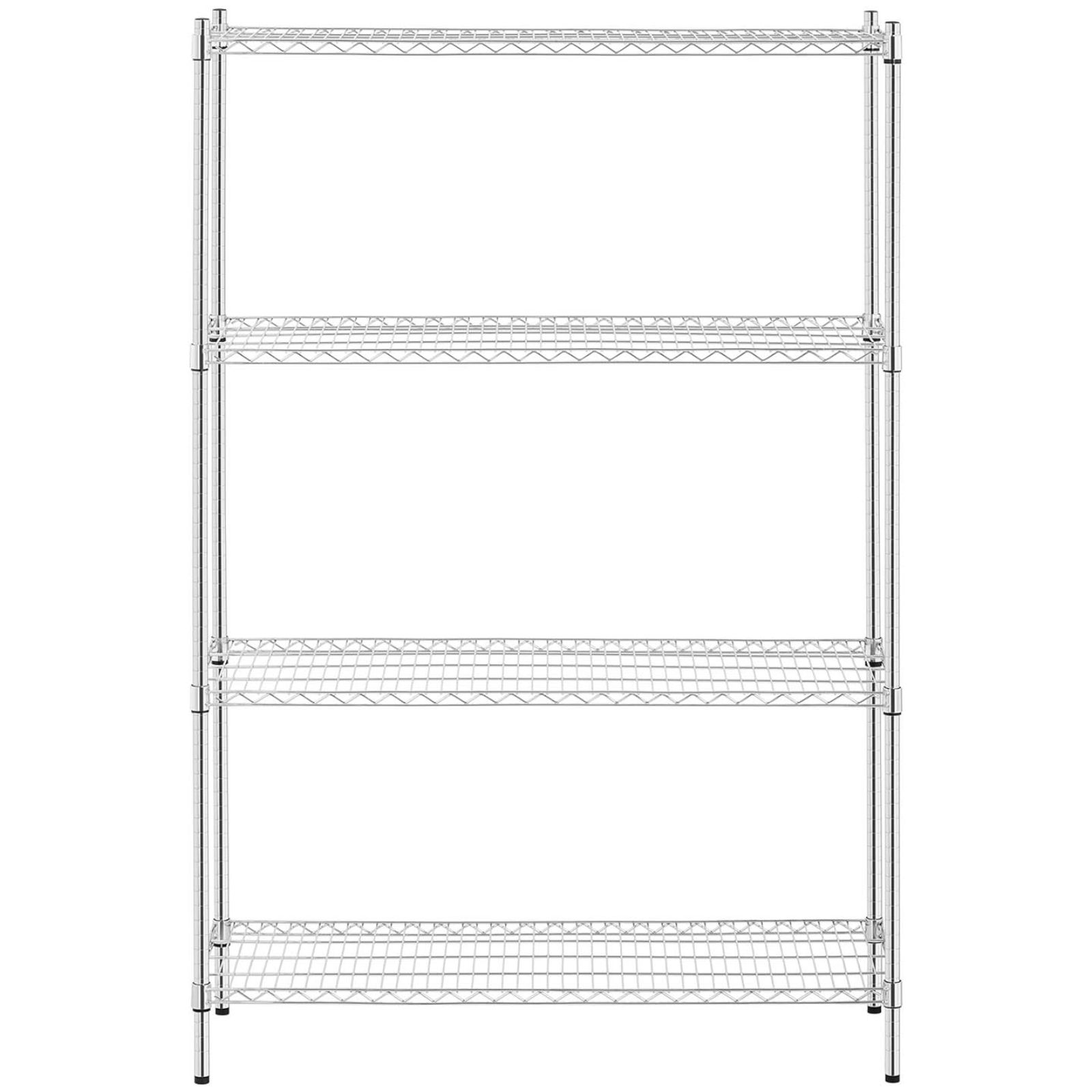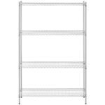 Regał druciany posiada 4 półki o rozmiarach 1200 x 450 mm a każda z nich jest w stanie wytrzymać obciążenie do 250 kg. Solidne słupki o wysokości 180 cm i średnicy 25 mm zapewniają całości stabilność. Nóżki są regulowane, dzięki czemu można ustawić regał nawet na nierównym podłożu. Konstrukcję wykonano z trwałej i estetycznej stali węglowej co zapewnia wieloletnie użytkowanie. Chromowane wykończenie sprawdzi się w suchych i ogrzewanych pomieszczeniach. Otwarte półki umożliwiają dojście do regału z każdej strony. Montaż mebla jest łatwy a niezbędne akcesoria dostarczone są w komplecie.