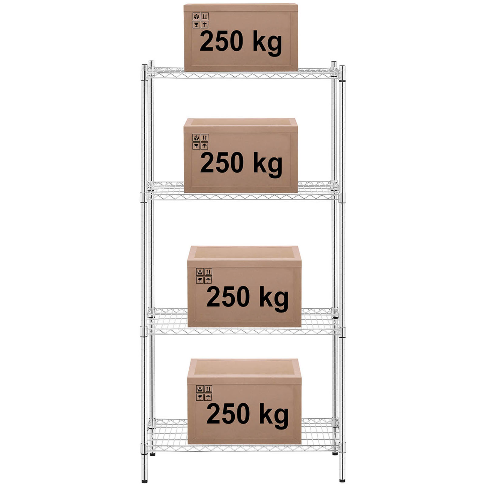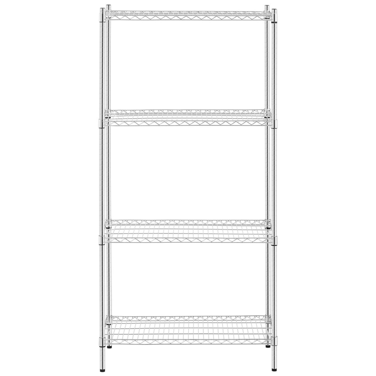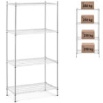 Regał druciany posiada 4 półki o rozmiarach 900 x 450 mm a każda z nich jest w stanie wytrzymać obciążenie do 250 kg. Solidne słupki o wysokości 180 cm i średnicy 25 mm zapewniają całości stabilność. Nóżki są regulowane, dzięki czemu można ustawić regał nawet na nierównym podłożu. Konstrukcję wykonano z trwałej i estetycznej stali węglowej co zapewnia wieloletnie użytkowanie. Chromowane wykończenie sprawdzi się w suchych i ogrzewanych pomieszczeniach. Otwarte półki umożliwiają dojście do regału z każdej strony. Montaż mebla jest łatwy a niezbędne akcesoria dostarczone są w komplecie.