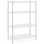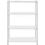 Regał druciany posiada 4 półki o rozmiarach 600 x 1200 mm a każda z nich jest w stanie wytrzymać obciążenie do 250 kg. Solidne słupki o wysokości 1800 mm i średnicy 25 mm zapewniają całości stabilność. Konstrukcję wykonano z trwałej i estetycznej stali węglowej co zapewnia wieloletnie użytkowanie. Otwarte półki umożliwiają dojście do regału z każdej strony. Montaż mebla jest łatwy a wszystkie akcesoria dostarczone są w komplecie. Dzięki matom z PP możliwe jest umieszczenie na regale małych przedmiotów.