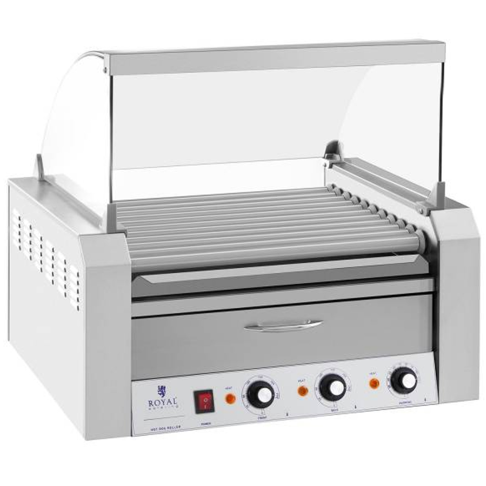 Grill rolkowy Royal Catering to niezastąpione urządzenie w barach szybkiej obsługi, food truckach, sklepach spożywczych, punktach gastronomicznych na plenerowych imprezach, a także stacjach benzynowych. Model RCHG-11WO umożliwia równoczesne przyrządzenie 20 parówek, fankfurterek, kabanosów itp.