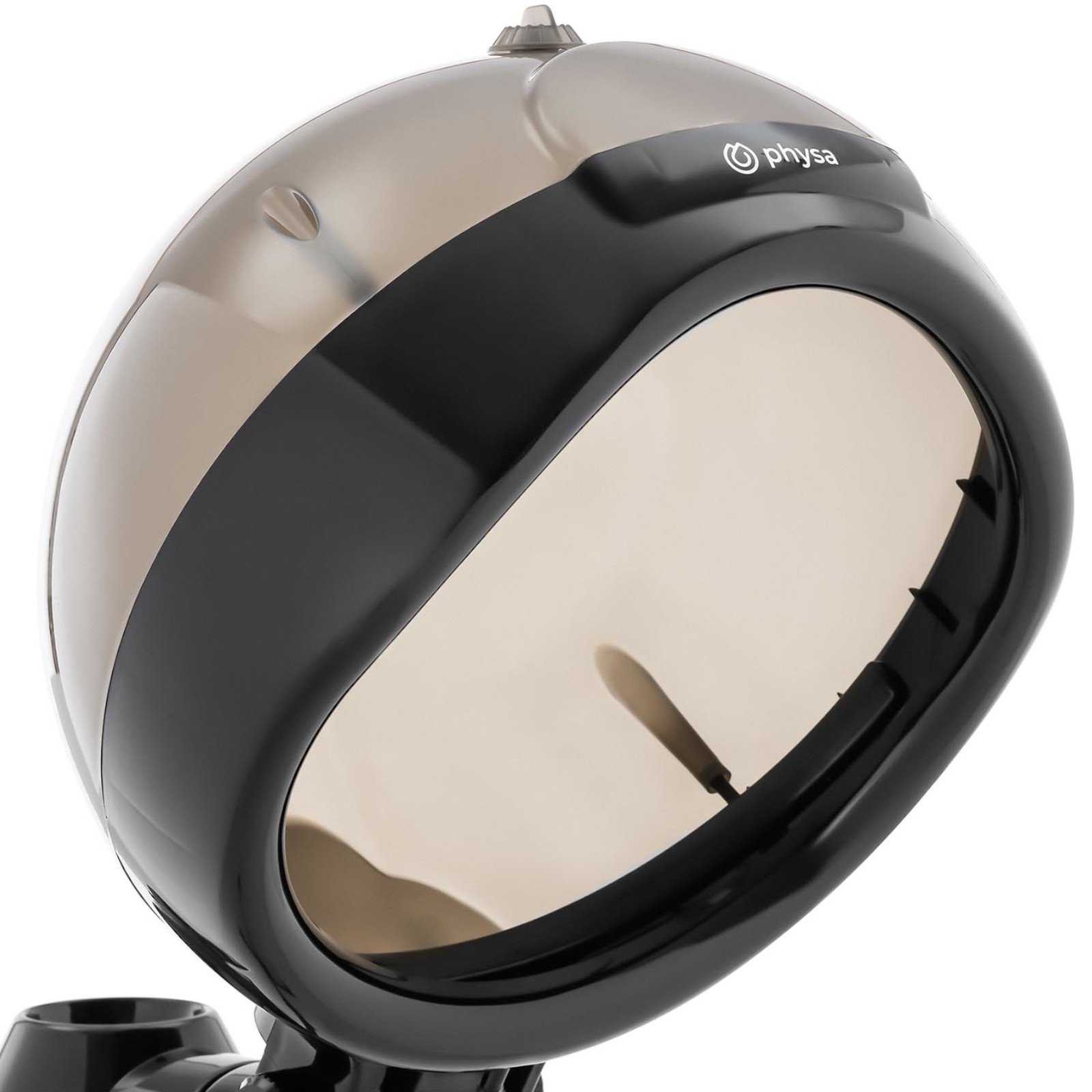 Nawilżacz do włosów marki PHYSA idealnie nadaje się do salonów fryzjerskich. Urządzenie jest delikatne, mobilne i proste w użyciu. Włączysz je zapomocą przełącznika i pokrętła, a płynnie działające kółka pozwolą postawić saunę w dowolnym miejscu. Urządzenie jest przystosowane do codziennego użytku w salonach fryzjerskich, strefach SPA, hotelach z ofertą wellness, ale sprawdzi się również w użytku domowym. Opuszczając dysze nawilżacza, osiąga temperaturę 65°C i osiąga około 50°​​C wewnątrz hełmu. Ciepła wilgotna atmosfera otwiera mieszki włosowe, co sprawia, że produkty pielęgnacyjne łatwiej wnikają w skórę i we włosy. Regulowany statyw można dostosować do indywidualnych potrzeb w zakresie od 106 do 146 cm, a timer pozwala na określenie długości zabiegu do 60 minut. Fryzjerska sauna posiada pojemnik na wodę o pojemności 750 cm³, do którego najlepiej wlewać wodę destylowaną. Jeżeli w zbiorniku wody zabraknie cieczy, urządzenie samoistnie się wyłącza.