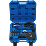 Ściągacz do łożysk marki MSW to zestaw narzędzi do bezpiecznego montażu/demontażu łożysk piasty przedniej i tylnej w samochodach Volkswagen T5 i Touareg (85 mm) z felgami 16”. Obsługa nie wymaga dużego wysiłku i pozwala zaoszczędzić czas. Produkt nie wymaga demontażu elementów zawieszenia ani wyrównania kół. Świetnie nadaje się do profesjonalnego użytku w warsztatach mechanicznych i serwisach pojazdów. Wykonanie z oksydowanej stali węglowej sprawia, że narzędzia są trwałe i odporne na korozję. Mają długą żywotność. Ściągacz do łożysk znajduje się w wygodnej walizce.