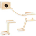 9-elementowa ścianka wspinaczkowa dla kota marki Wiesenfield oferuje kotom możliwość wspinania się i skakania, a tym samym zapewnia im zdrową dawkę ruchu. Koty będą wspinać się po stopniach i podziwiać z nich swoje terytorium. Koci plac zabaw składa się z trzech stopni, jaskini, wiszącego mostu, sizalowej kolumny, sizalowej rampy, przytulnego hamaka i legowiska. Wszystkie elementy łatwo zamontować osobno na ścianie. Na legowisku kot może spać spokojnie lub obserwować, co dzieje się na dole w pokoju, może też schować się do przestronnej jaskini o wymiarach 37 x 37 x 30 cm. Hamak i schody dla kota zamontowane na ścianę zachęcą zwierzęta do naturalnego wspinania się i zapewnią im różnorodność. Niezależnie od tego, czy chce się zamontować zestaw, aby bawić się razem z kotami, czy pomóc im wspinać się, gdy nikogo nie ma w domu, schody dla kotów pozwolą zadbać o właściwy rozwój zwierząt i pozwolą im utrzymać dobrą kondycję. Stopnie dla kota można umieścić w wybranych przez siebie odstępach, czy to jako schody do szafki, czy do wygodnego hamaka. Koty uwielbiają również korzystać z owiniętego sizalem słupka, aby wspinać się lub rozciągać. Właściciele balkonów mogą zamontować schody i most wiszący na poręczy lub ścianie, aby kot mógł bezpiecznie wspiąć się na górę i obserwować ptaki, słuchać natury i oddychać świeżym powietrzem. Zestaw wytrzymuje obciążenie 10 kg. Elementy wykonane są z drewna i dodatkowo pokryte miękkim pluszem, który zapobiega ślizganiu się łapek i zapewnia kotom bezpieczne skakanie ze stopnia na stopień. Hamak ścienny ma wymiary 41 x 30 cm i dzięki miękkiej powierzchni zachęca do relaksu i drzemki.