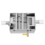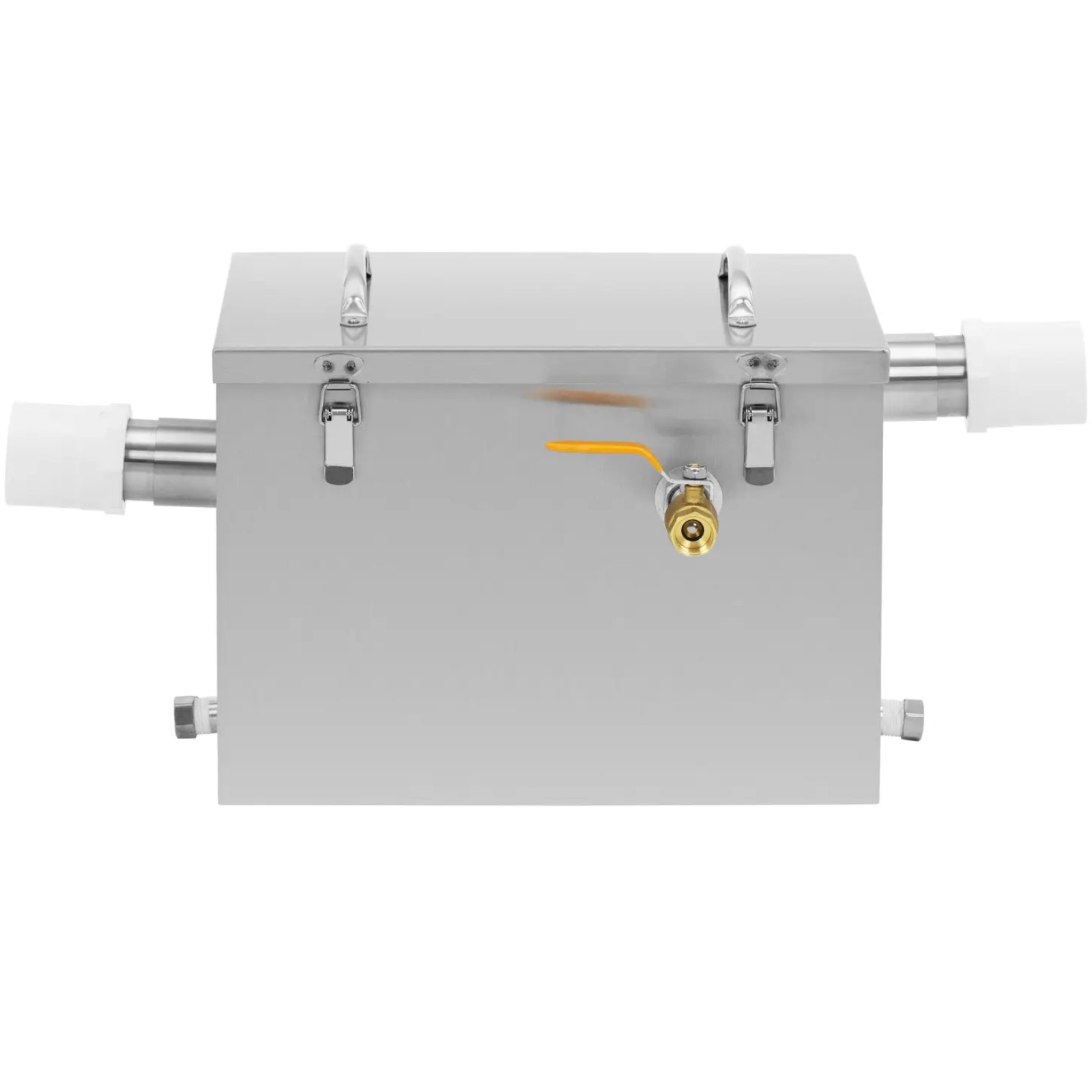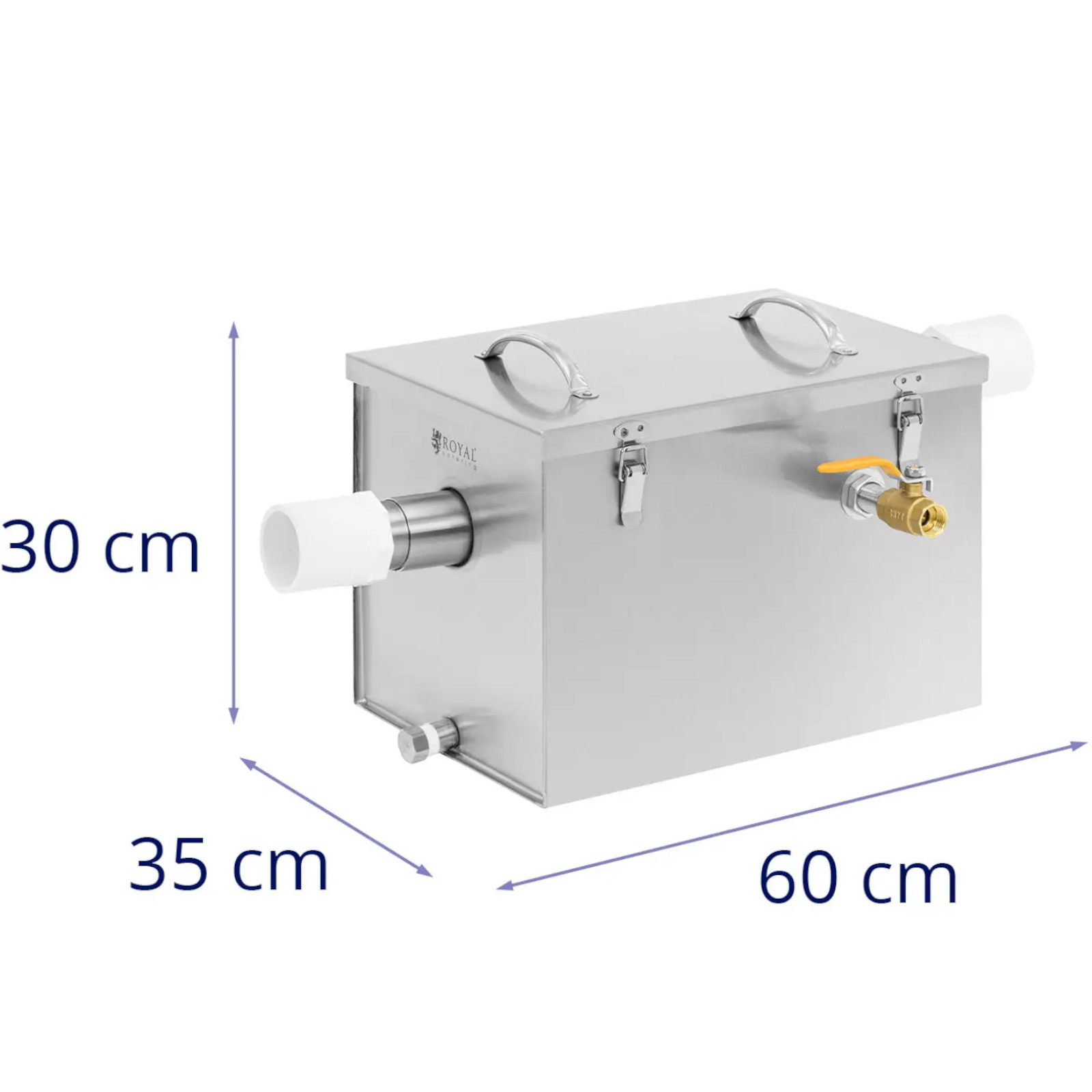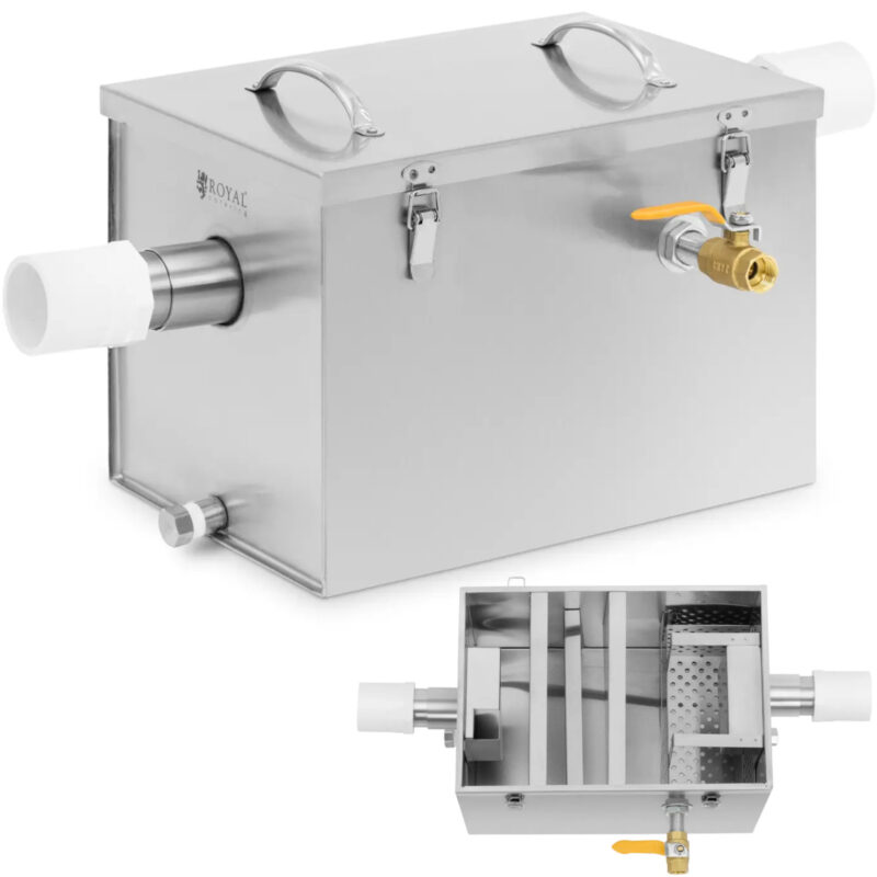 Separator tłuszczu marki Royal Catering sprawdzi się w każdej profesjonalnej gastronomii. Za pomocą urządzenia oddziela się tłuszcz od brudnej wody przed odprowadzeniem jej do kanalizacji. W ten sposób separator ochroni zarówno odpływ, jak i rury przed zatkaniem. Obudowa urządzenia wykonana została z wysokiej jakości stali nierdzewnej, gwarantującej solidność i trwałość. Materiał jest też wysoce odporny na czynniki biologiczne i chemiczne. Dzięki dużej pojemności 21 l podzlewowy separator tłuszczu zbiera do 15 l ścieków z tłuszczami zwierzęcymi lub roślinnymi. Wewnętrzny koszyk o drobnych oczkach wyłapuje cały tłuszcz i pozostałości, dzięki czemu czyszczenie urządzenia jest szczególnie łatwe. Zebrany osad wyrzuca się oddzielnie w celu utylizacji lub recyklingu. Kurek spustowy umożliwia spuszczenie oddzielonych tłuszczy i olejów w zaledwie kilku prostych krokach. Aby ułatwić obsługę, kurek jest wyposażony w pomocne symbole ON i OFF, a wlot i wylot są zaprojektowane tak, aby były szczególnie szerokie dla zmniejszenia ryzyka zatkania. Pokrywa zamykana jest za pomocą praktycznych zatrzasków, a uszczelka zapobiega przedostawaniu się niepożądanych zapachów na zewnątrz. Pokrywa jest wyposażona w dwa uchwyty, dzięki czemu można ją zdjąć bez wysiłku. Oddzielny kosz wewnątrz jest równie łatwy do wyjęcia. Skraca to czas czyszczenia i konserwacji do minimum.