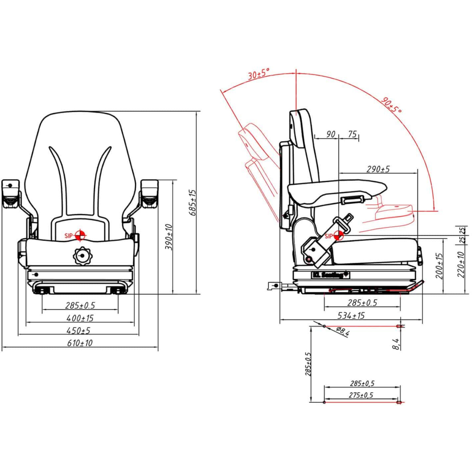 Siedzenie fotel regulowany z podłokietnikami i pasem do ciągnika siedzisko 42x47cm